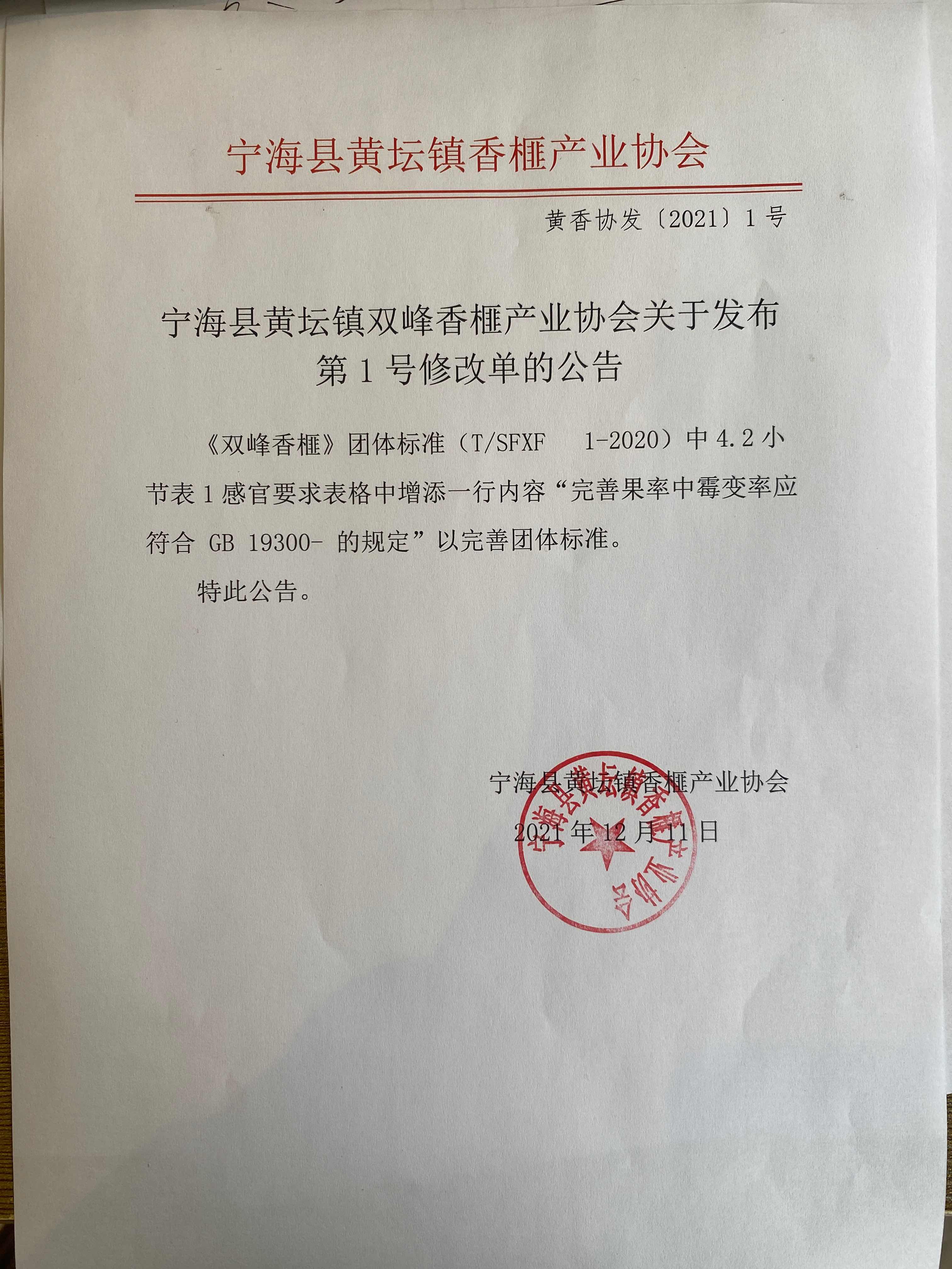 1宁海县黄坛镇双峰香榧产业协会关于发布第1号修改单的公告