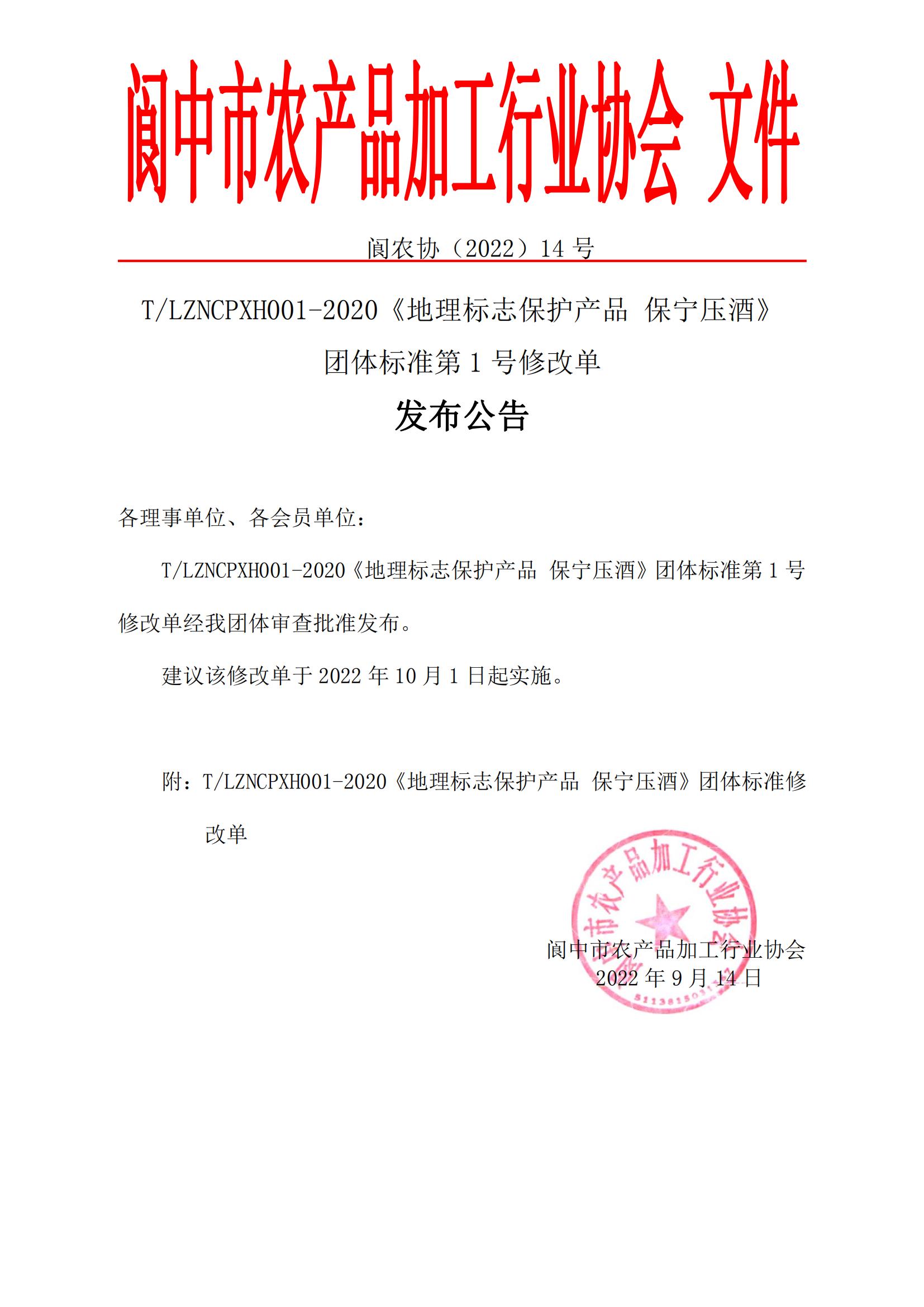 阆中市农产品加工行业协会 T/LZNCPXH001-2020《国家地理标志保护产品 保宁压酒》团体标准第1号修改单)