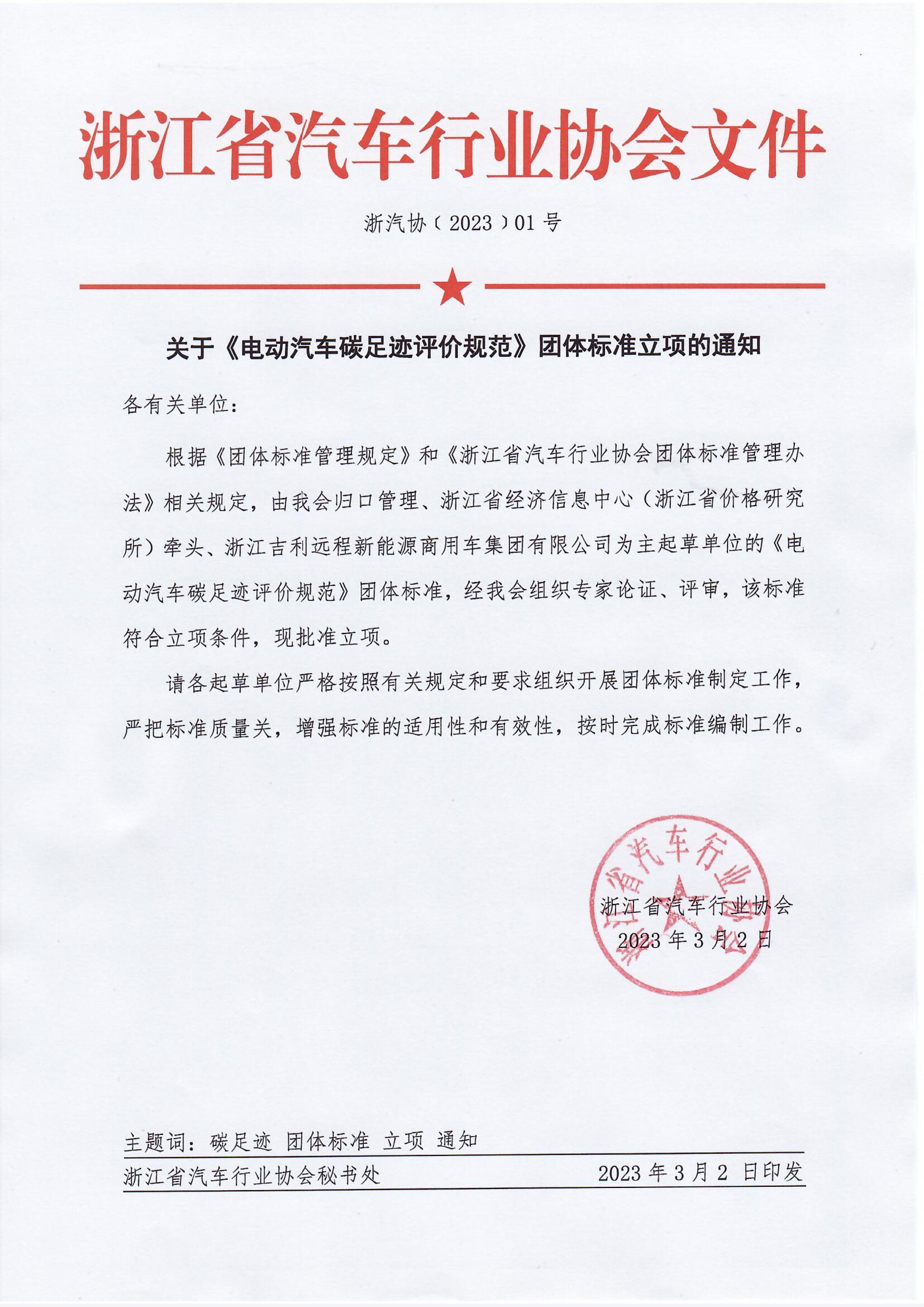 根据《团体标准管理规定》和《浙江省汽车行业协会团体标准管理办法》相关规定,由我会归口管理、浙江省经济信息中心(浙江省价格研究所)牵头、浙江吉利远程新能源商用车集团有限公司为主起草单位的《电动汽车碳足迹评价规范》团体标准,经我会组织专家论证、评审,该标准符合立项条件,现批准立项。