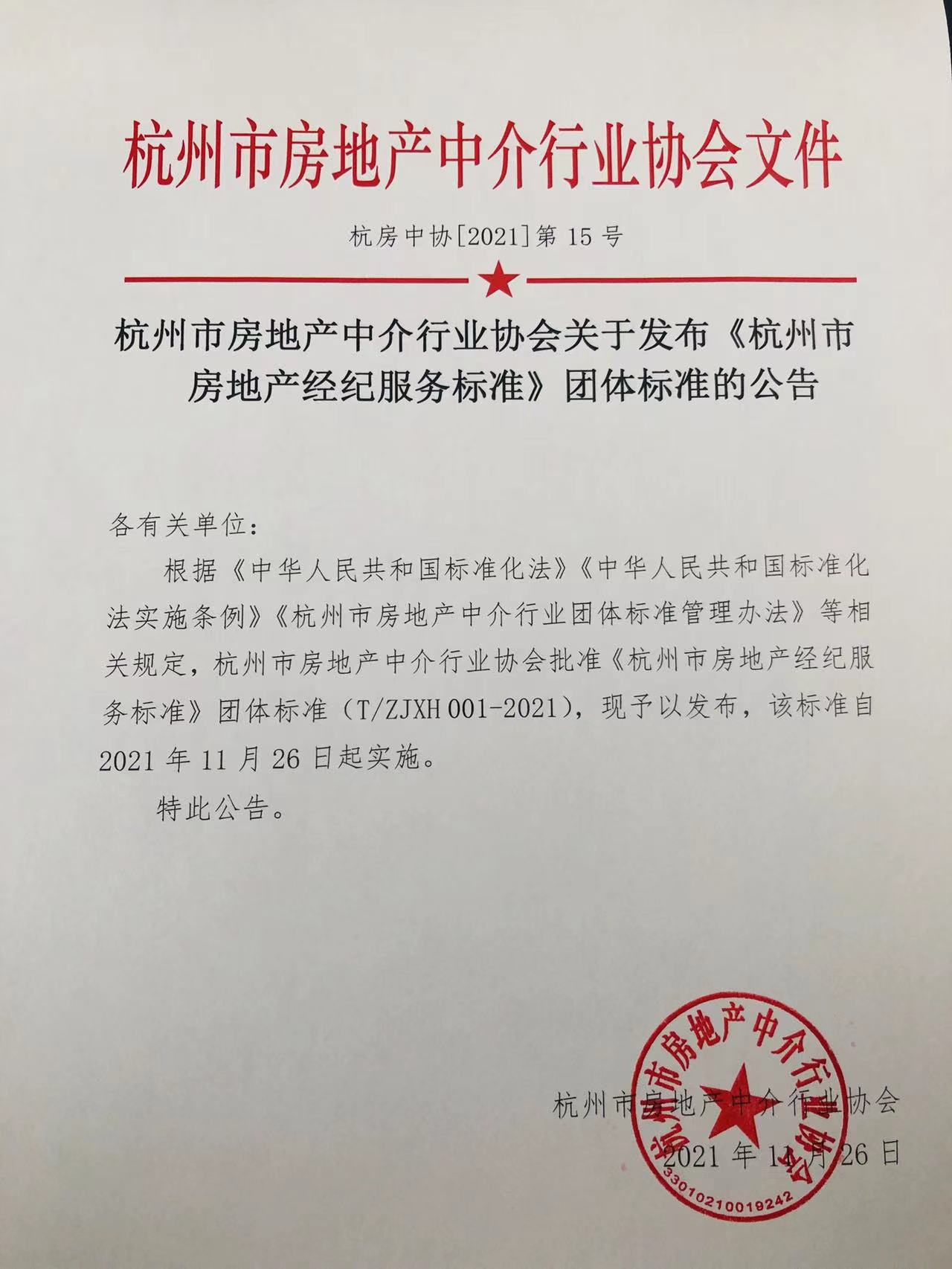 根据《中华人民共和国标准化法》《中华人民共和国标准化法实施条例》《杭州市房地产中介行业团体标准管理办法》等相关规定,杭州市房地产中介行业协会批准《杭州市房地产经纪服务标准》团体标准(T/ZJXH 001-2021),现予以发布,该标准自2021年11月26日起实施。