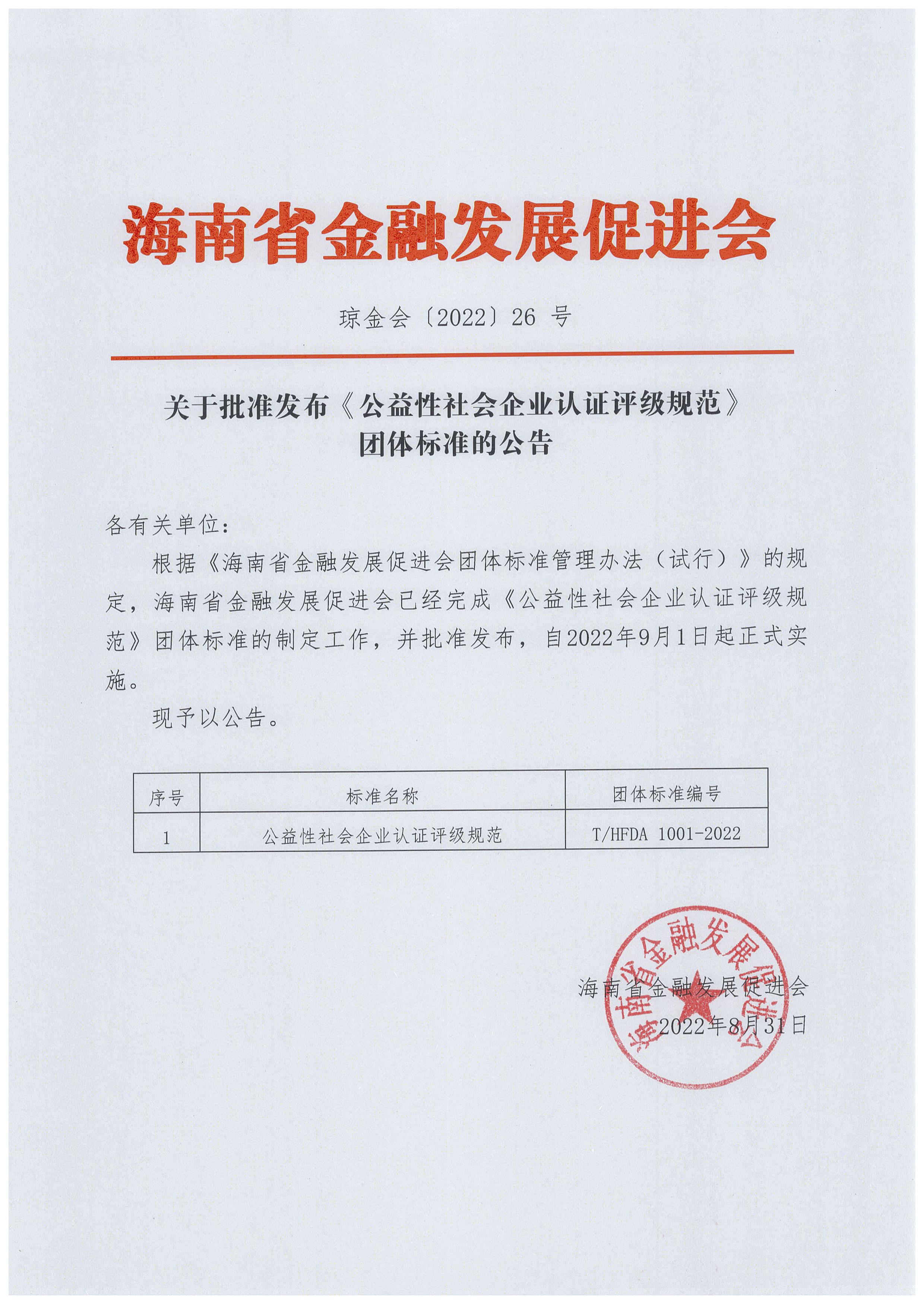 根据《海南省金融发展促进会团体标准管理办法(试行)》的规定,海南省金融发展促进会已经完成《公益性社会企业认证评级规范》(编号:T/HFDA 1001-2022)团体标准的制定工作,并批准发布,自2022年9月1日起正式实施。