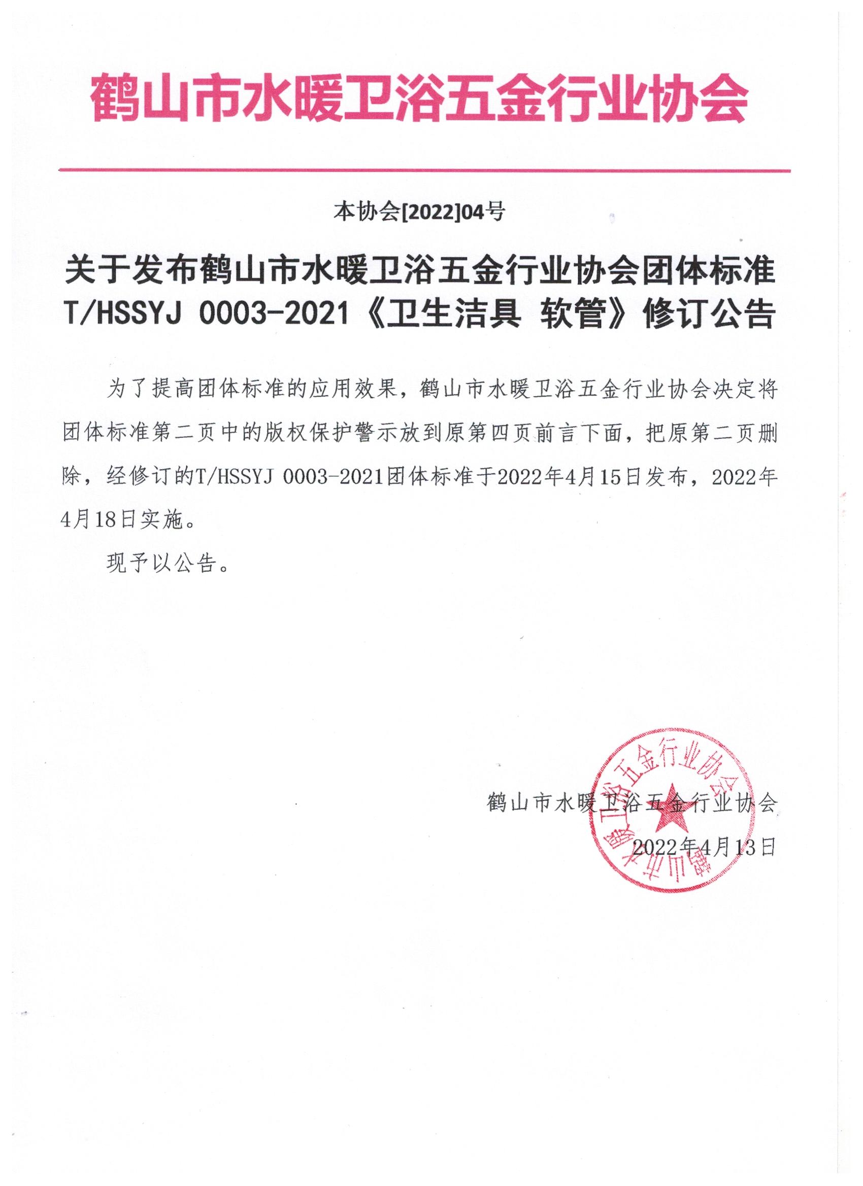 T/HSSYJ 0003-2021《卫生洁具 软管》团体标准第1号修改单经我团体审查批准发布。建议该修改单于2022年4月18日起实施。