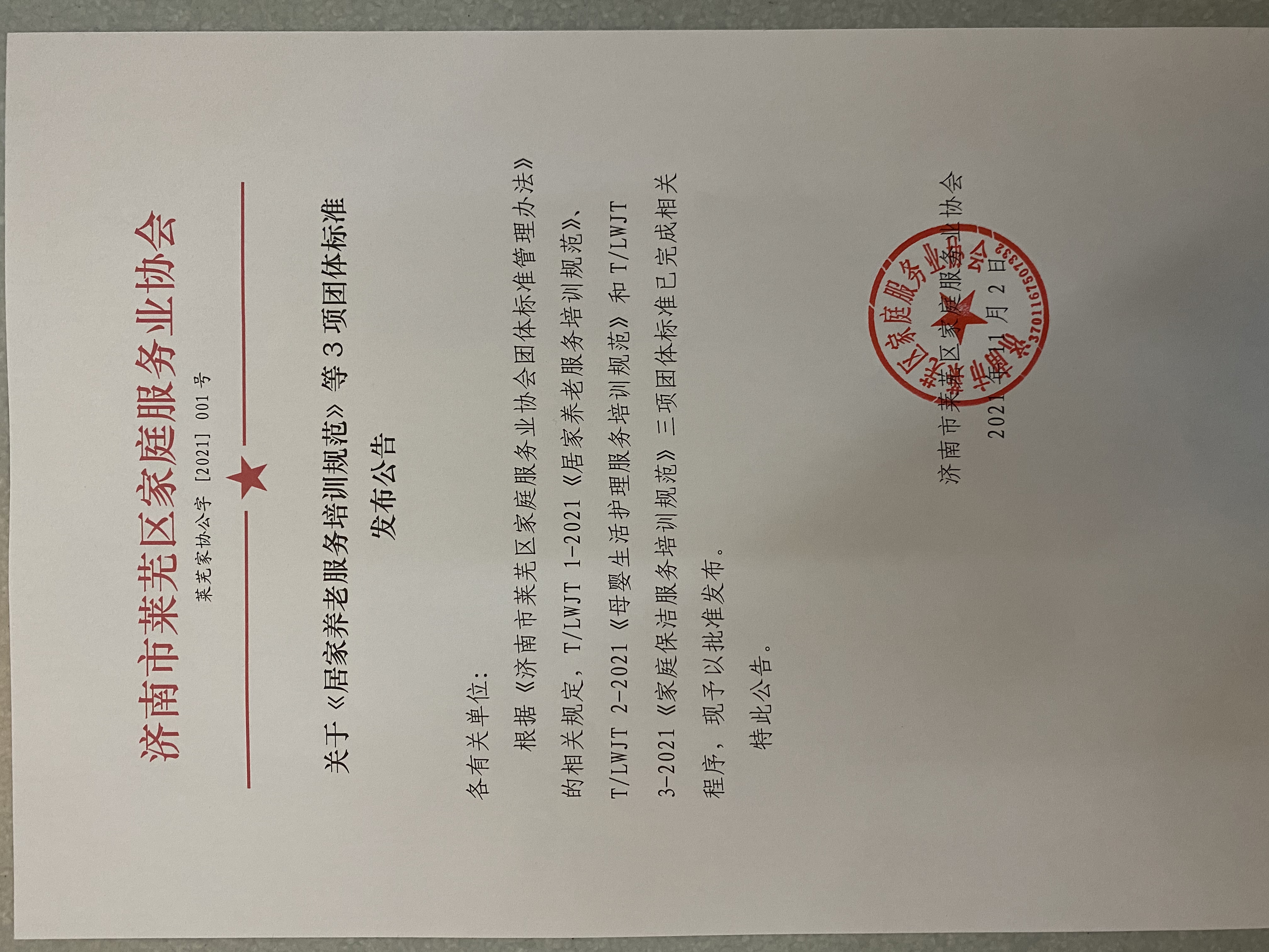根据《济南市莱芜区家庭服务业协会团体标准管理办法》的相关规定,T/LWJT 1-2021《居家养老服务培训规范》、T/LWJT 2-2021《母婴生活护理服务培训规范》和T/LWJT 3-2021《家庭保洁服务培训规范》三项团体标准已完成相关程序,现予以批准发布。