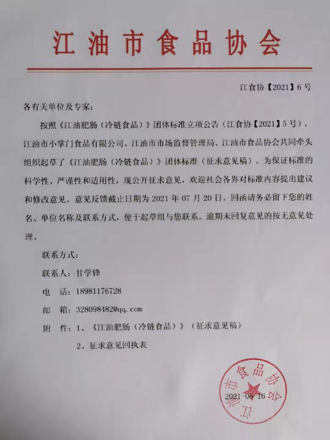 按照《江油肥肠(冷链食品)》团体标准立项公告(江食协【2021】5号),江油市小掌门食品有限公司、江油市市场监督管理局、江油市食品协会共同牵头组织起草了《江油肥肠(冷链食品)》团体标准(征求意见稿)。为保证标准的科学性、严谨性和适用性,现公开征求意见,欢迎社会各界对标准内容提出建议和修改意见。意见反馈截止日期为2021年07月20日。回函请务必留下您的姓名、单位名称及联系方式,便于起草组与您联系。逾期未回复意见的按无意见处理。