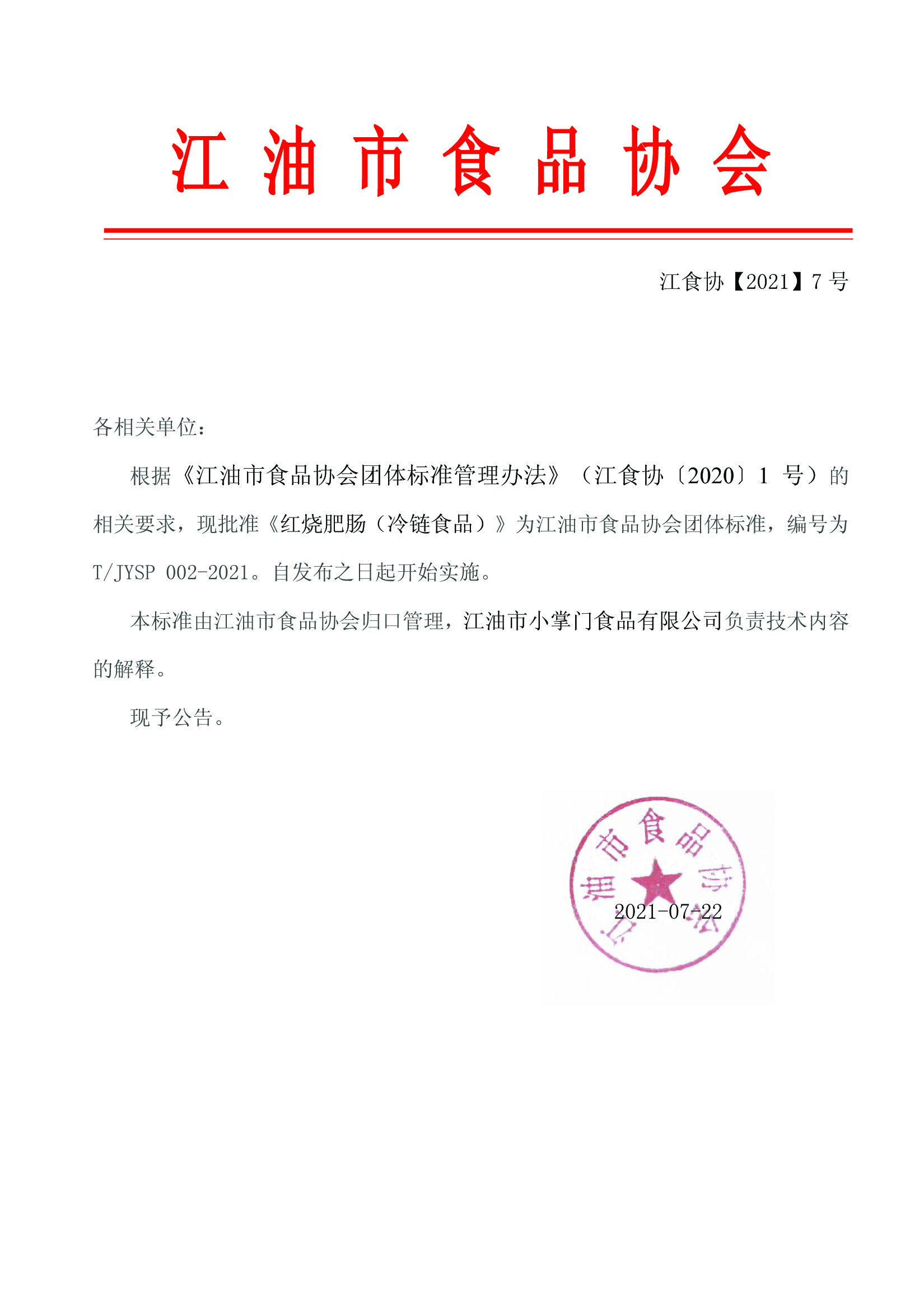 根据《江油市食品协会团体标准管理办法》(江食协〔2020〕1 号)的相关要求,现批准《红烧肥肠(冷链食品)》为江油市食品协会团体标准,编号为T/JYSP 002-2021。自发布之日起开始实施。