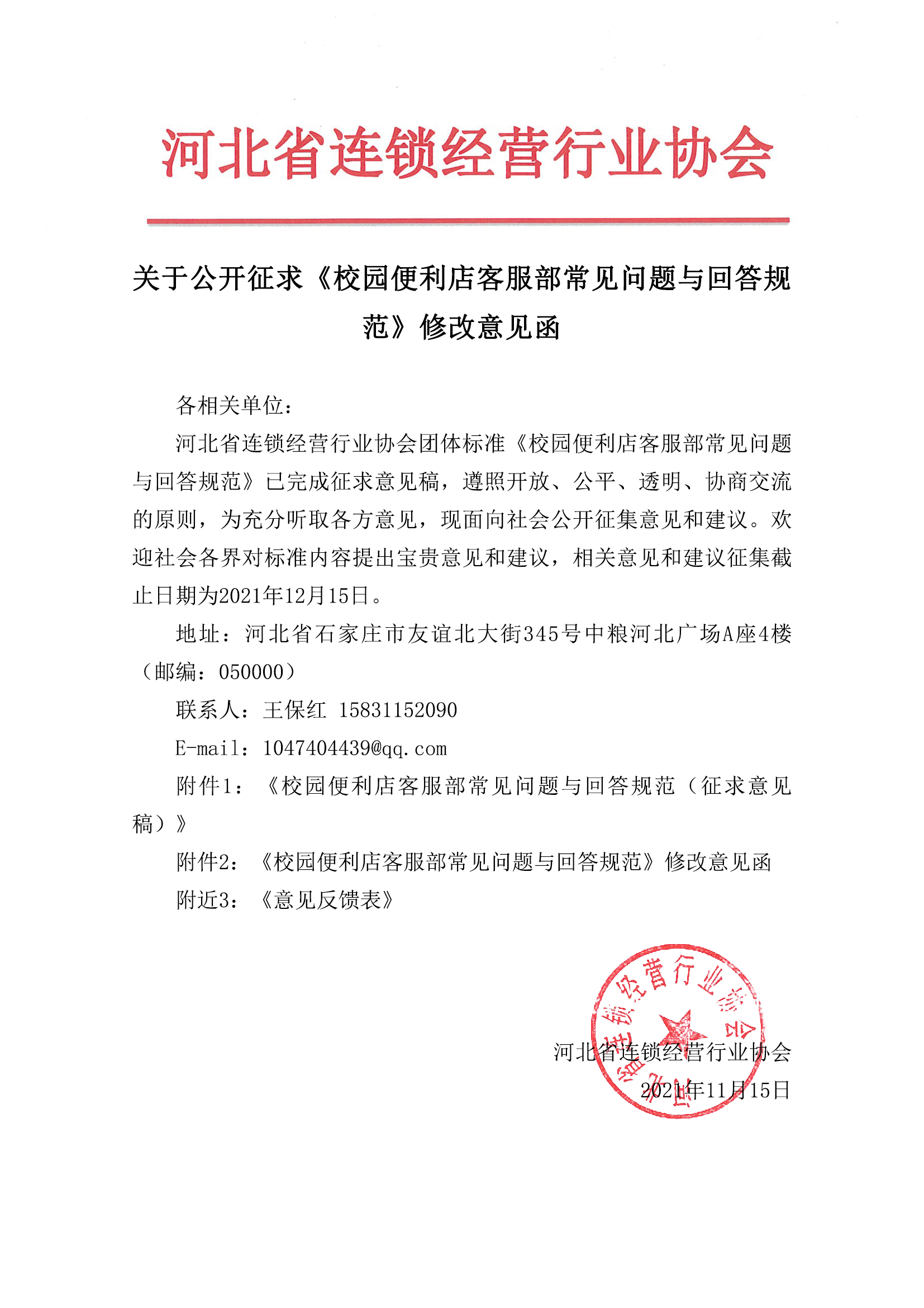 河北省连锁经营行业协会团体标准《校园便利店客服部常见问题与回答规范》已完成征求意见稿,遵照开放、公平、透明、协商交流的原则,为充分听取各方意见,现面向社会公开征集意见和建议。欢迎社会各界对标准内容提出宝贵意见和建议,相关意见和建议征集截止日期为2021年12月15日。