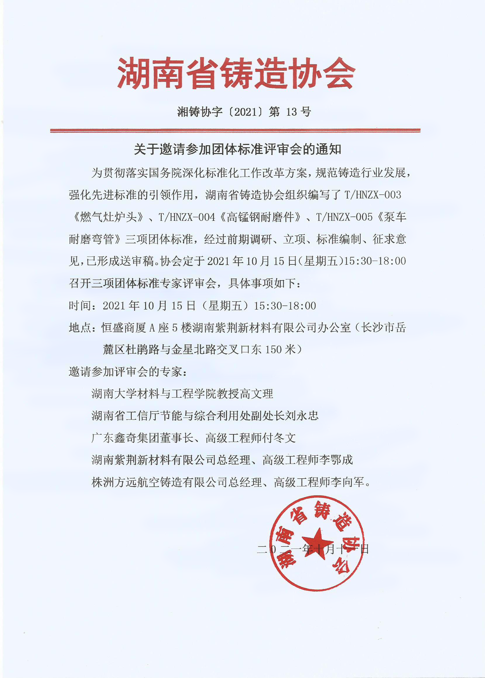 为贯彻落实国务院深化标准化工作改革方案,规范铸造行业发展,强化先进标准的引领作用,湖南省铸造协会组织编写了T/HNZX-003《燃气灶炉头》、T/HNZX-004《高锰钢耐磨件》、T/HNZX-005《泵车耐磨弯管》三项团体标准,经过前期调研、立项、标准编制、征求意见,已形成送审稿。协会定于2021年10月15日(星期五)15:30-18:00召开三项团体标准专家评审会,具体事项如下: