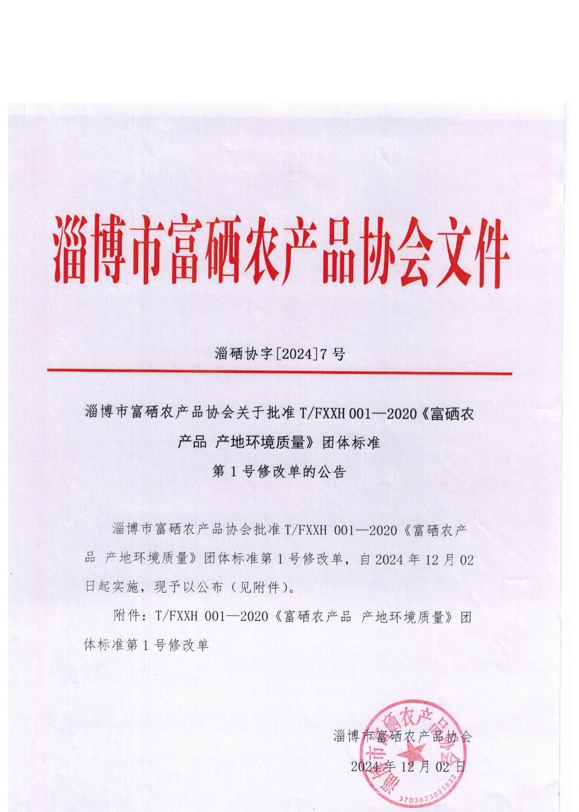 T/FXXH 001—2020《富硒农产品 产地质量环境》团体标准第1号修改单经我团体审查批准发布。建议该修改单于2024年12月02日起实施。