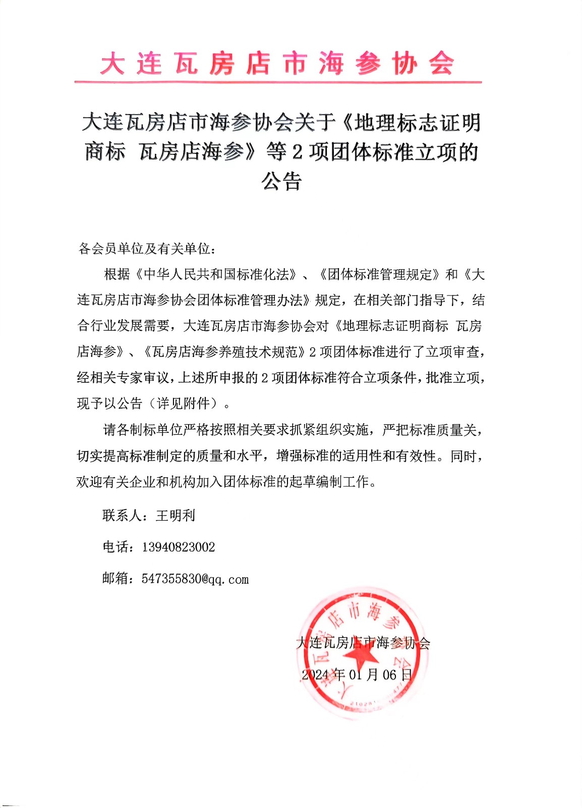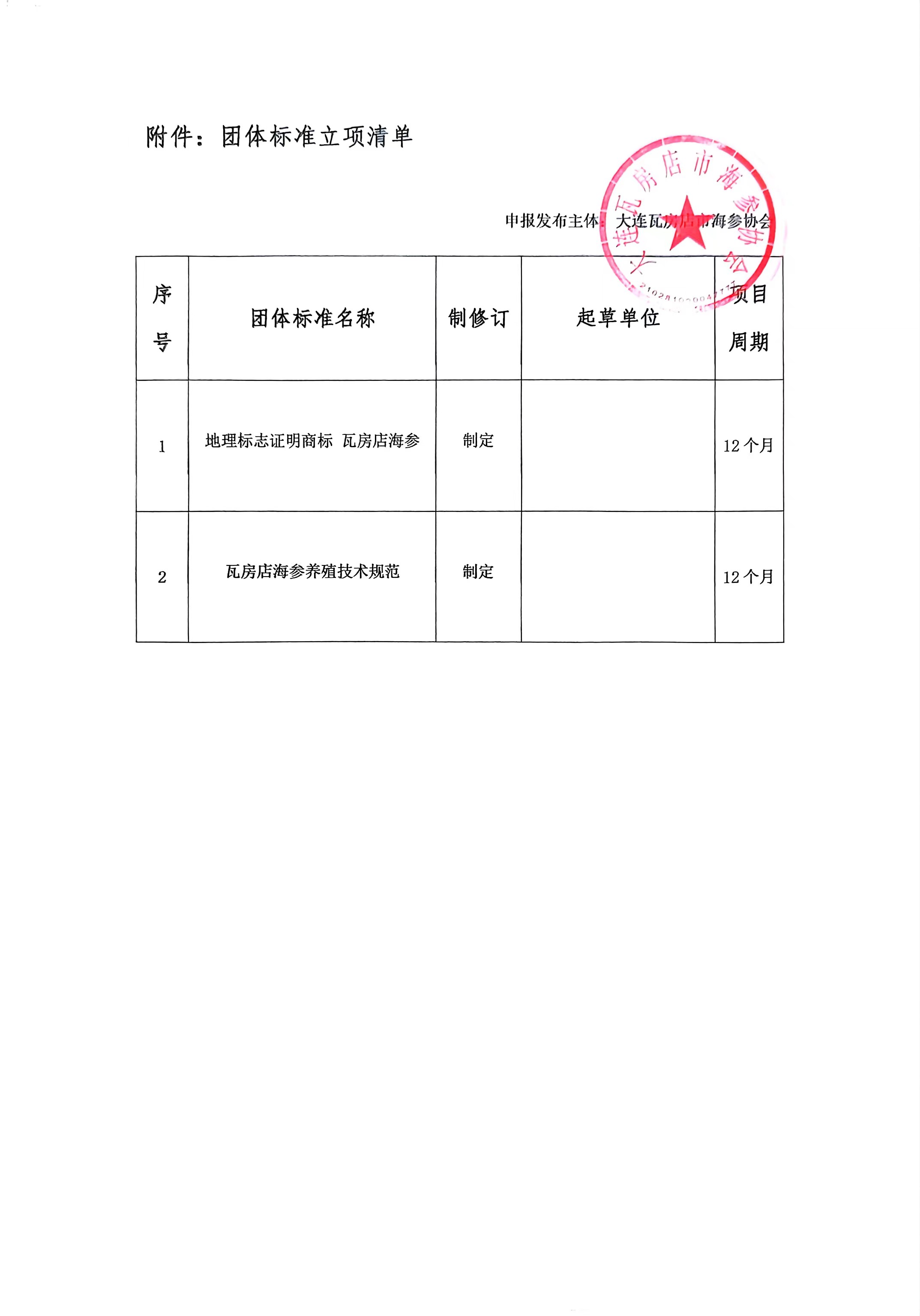 大连瓦房店市海参协会关于《地理标志证明商标 瓦房店海参》等2项团体标准立项的公告