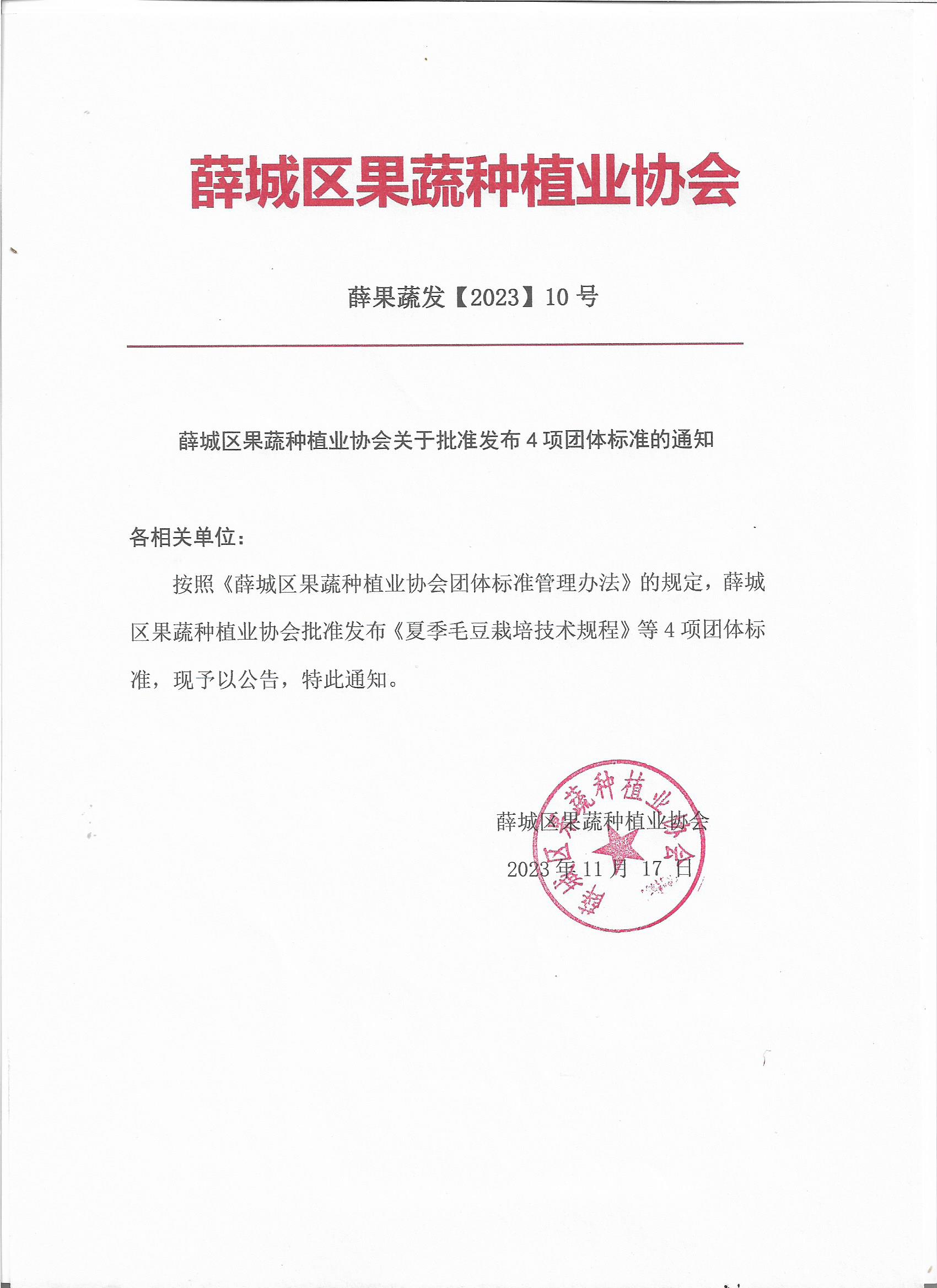按照《薛城区果蔬种植业协会团体标准管理办法》的规定,薛城区果蔬种植业协会批准发布《夏季毛豆栽培技术规程》等4项团体标准,现予以公告,特此通知。
