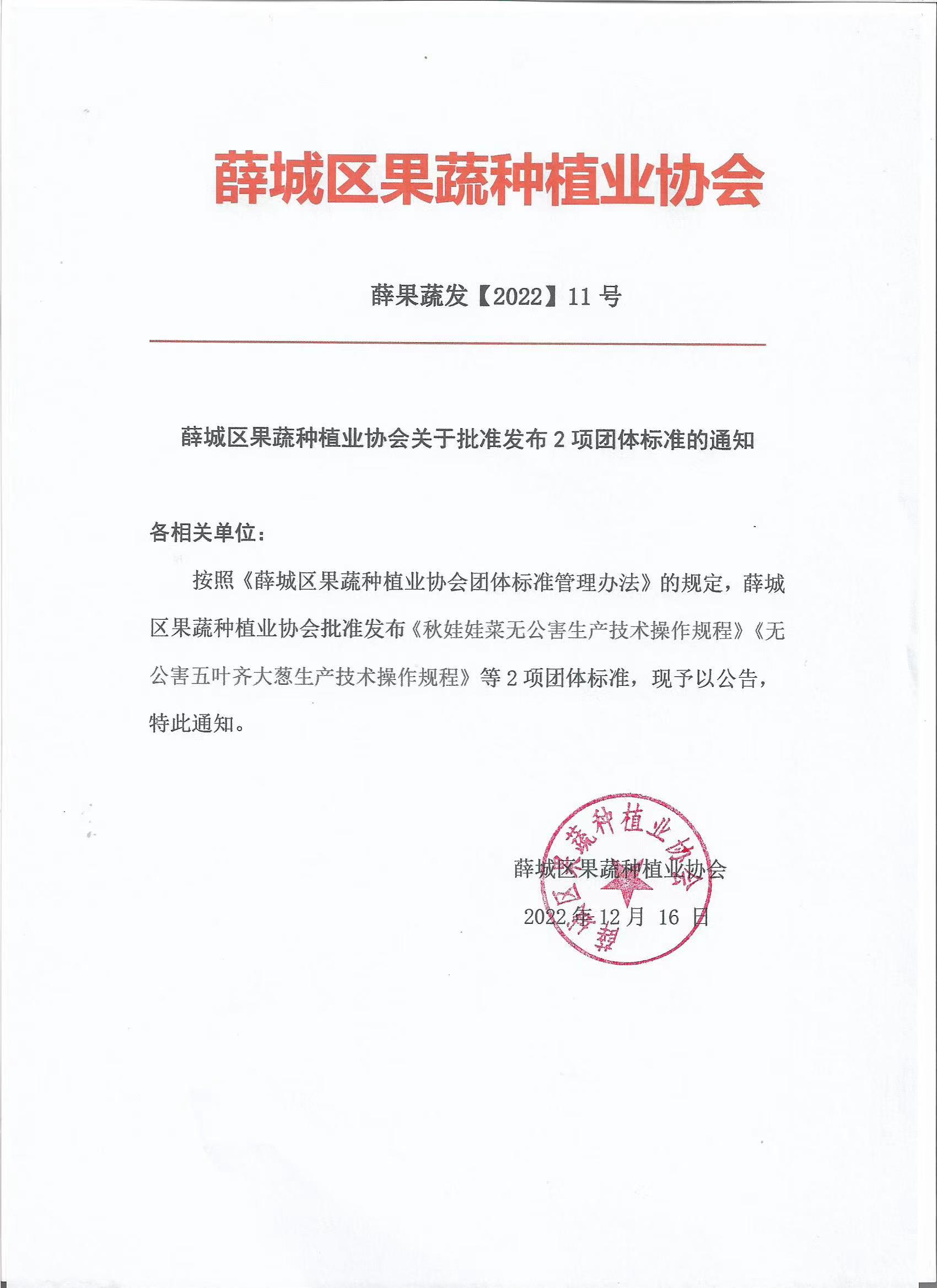 薛城区果蔬种植业协会关于批准发布2项团体标准的通知