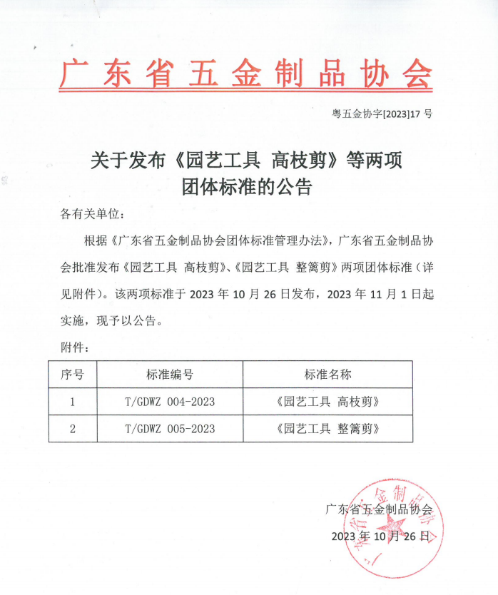 根据《广东省五金制品协会团体标准管理办法》,广东省五金制品协会批准发布《园艺工具 高枝剪》、《园艺工具 整篱剪》两项团体标准(详见附件)。该两项标准于2023年10月26日发布,2023年11月1日起实施,现予以公告。