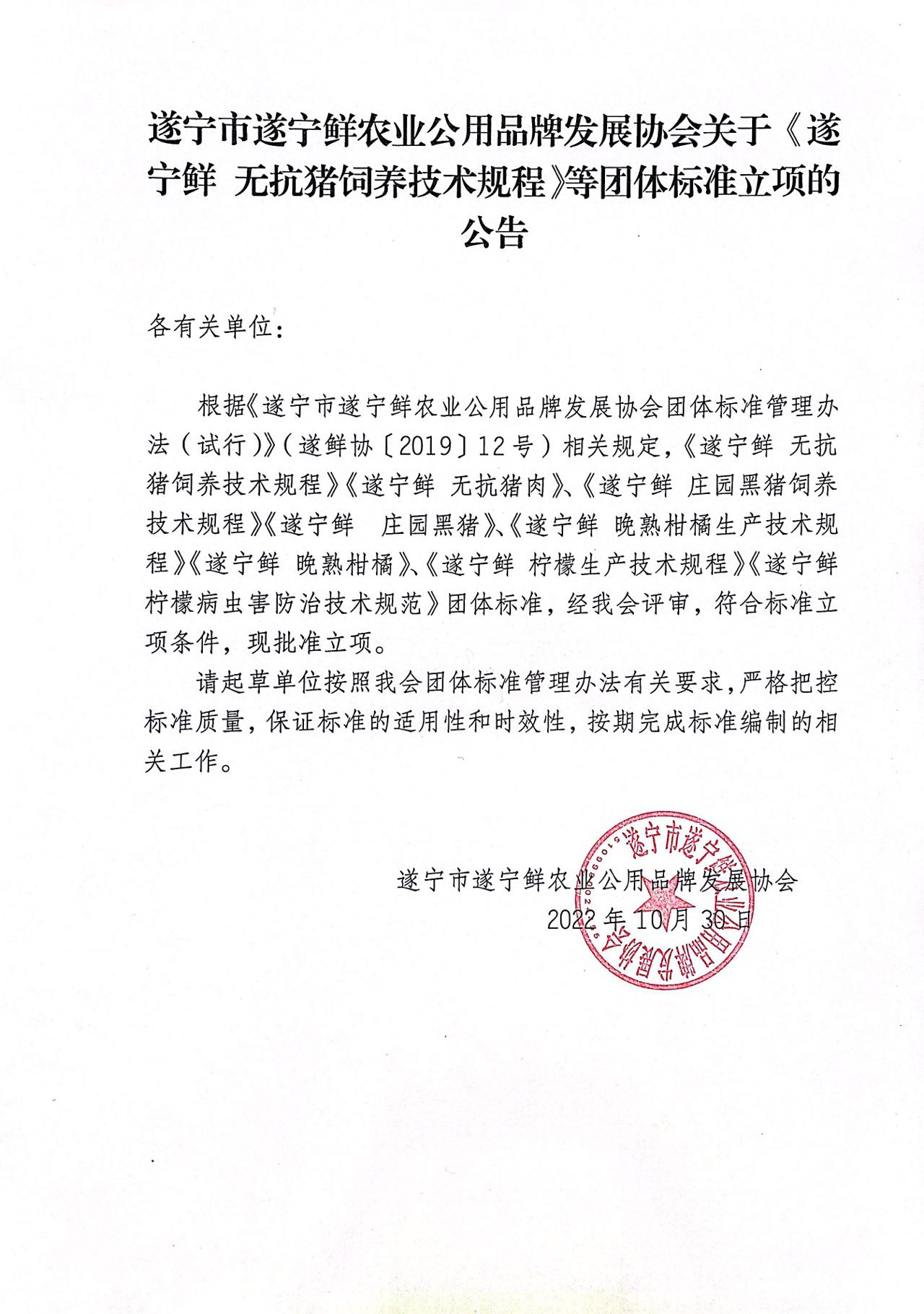遂宁市“遂宁鲜”农业公用品牌发展协会关于《遂宁鲜 无抗猪饲养技术规程》等团体标准的立项公告