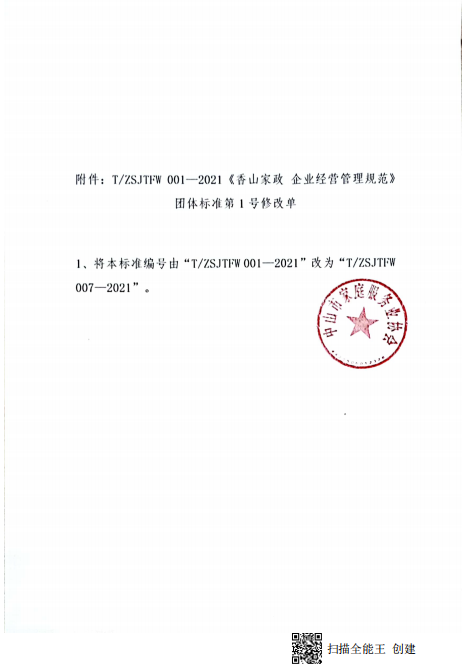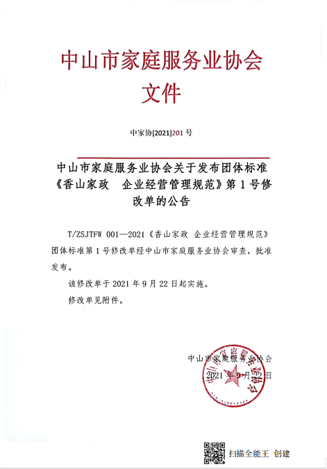 T/ZSJTFW 001—2021《香山家政 企业经营管理规范》团体标准第1号修改单经我团体审查批准发布。建议该修改单于2021年9月22日起实施。