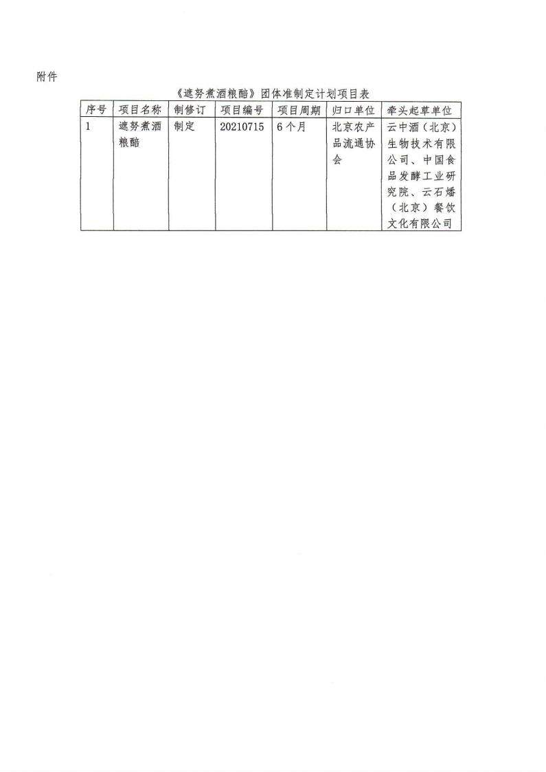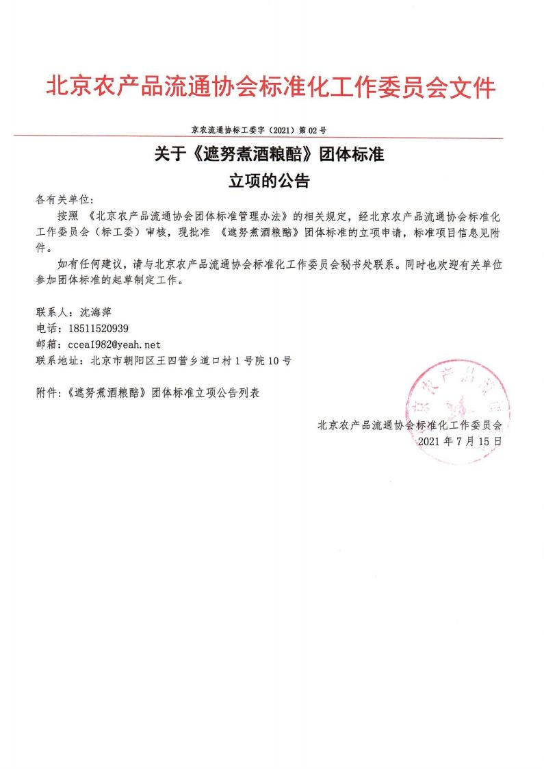 按照 《北京农产品流通协会团体标准管理办法》的相关规定,经北京农产品流通协会标准化工作委员会(标工委)审核,现批准 《遮努煮酒粮醅》团体标准的立项申请,标准项目信息见附件。