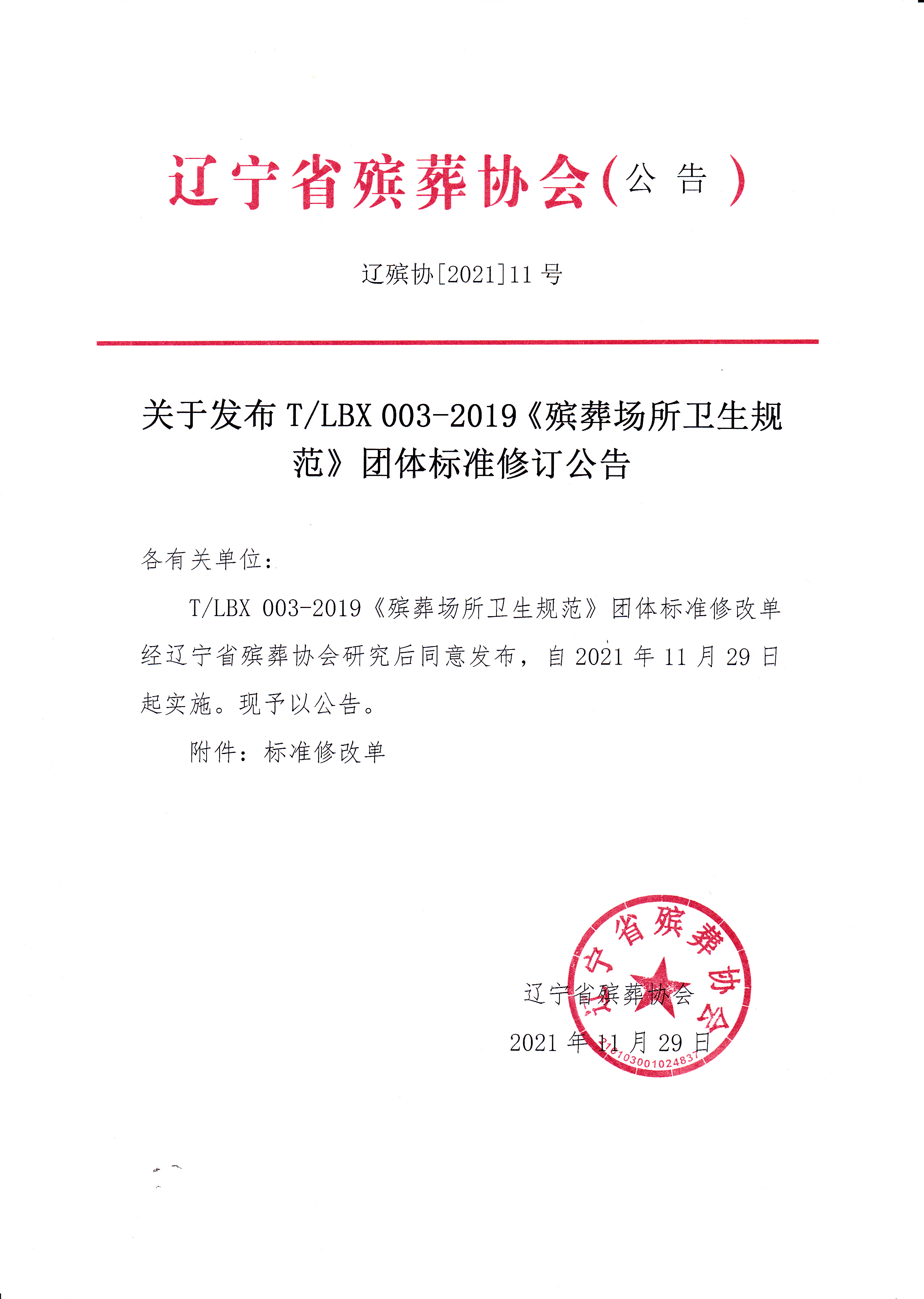 T/LBX 003-2019 《殡葬场所卫生规范》团体标准第1号修改单经我团体审查批准发布。建议该修改单于2021年11月29日起实施。