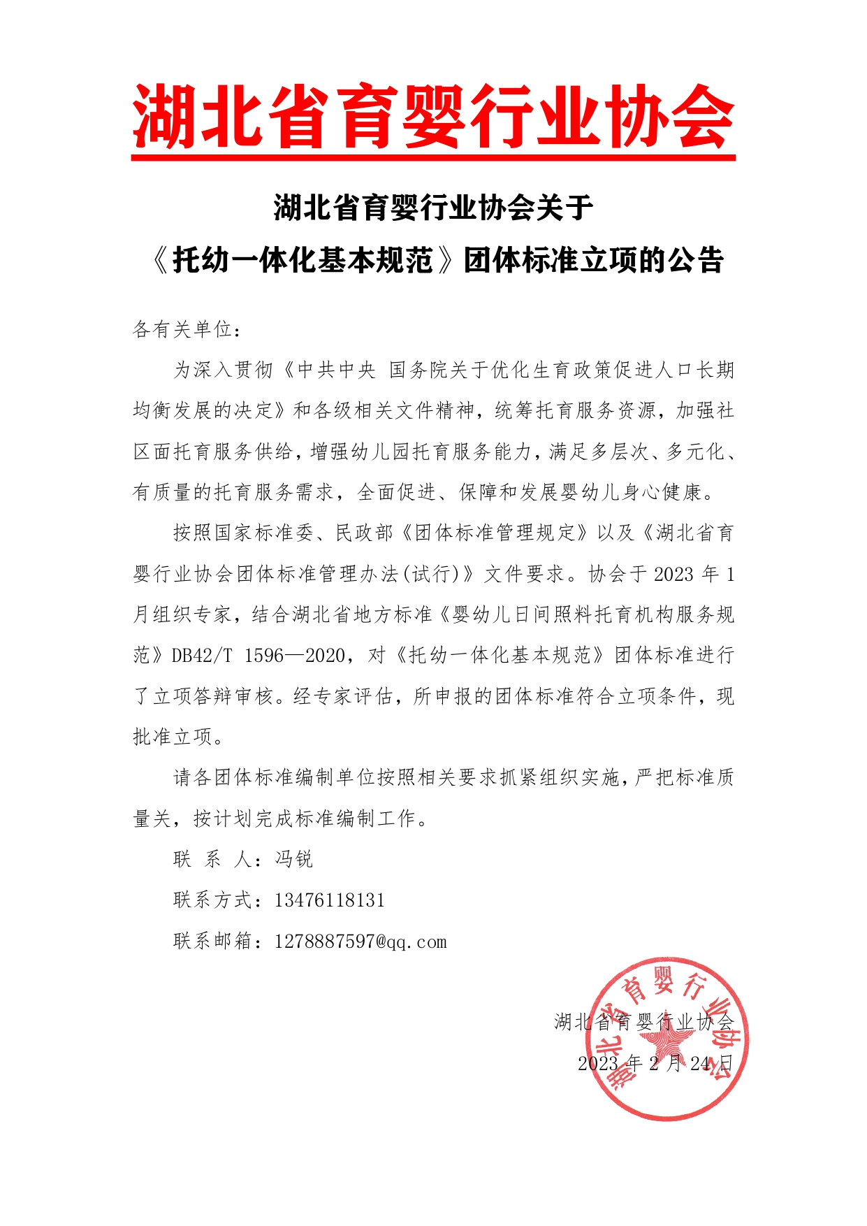 按照国家标准委、民政部《团体标准管理规定》以及《湖北省育婴行业协会团体标准管理办法(试行)》文件要求。协会于2023年1月组织专家,结合湖北省地方标准《婴幼儿日间照料托育机构服务规范》DB42/T 1596—2020,对《托幼一体化基本规范》团体标准进行了立项答辩审核。经专家评估,所申报的团体标准符合立项条件,现批准立项。