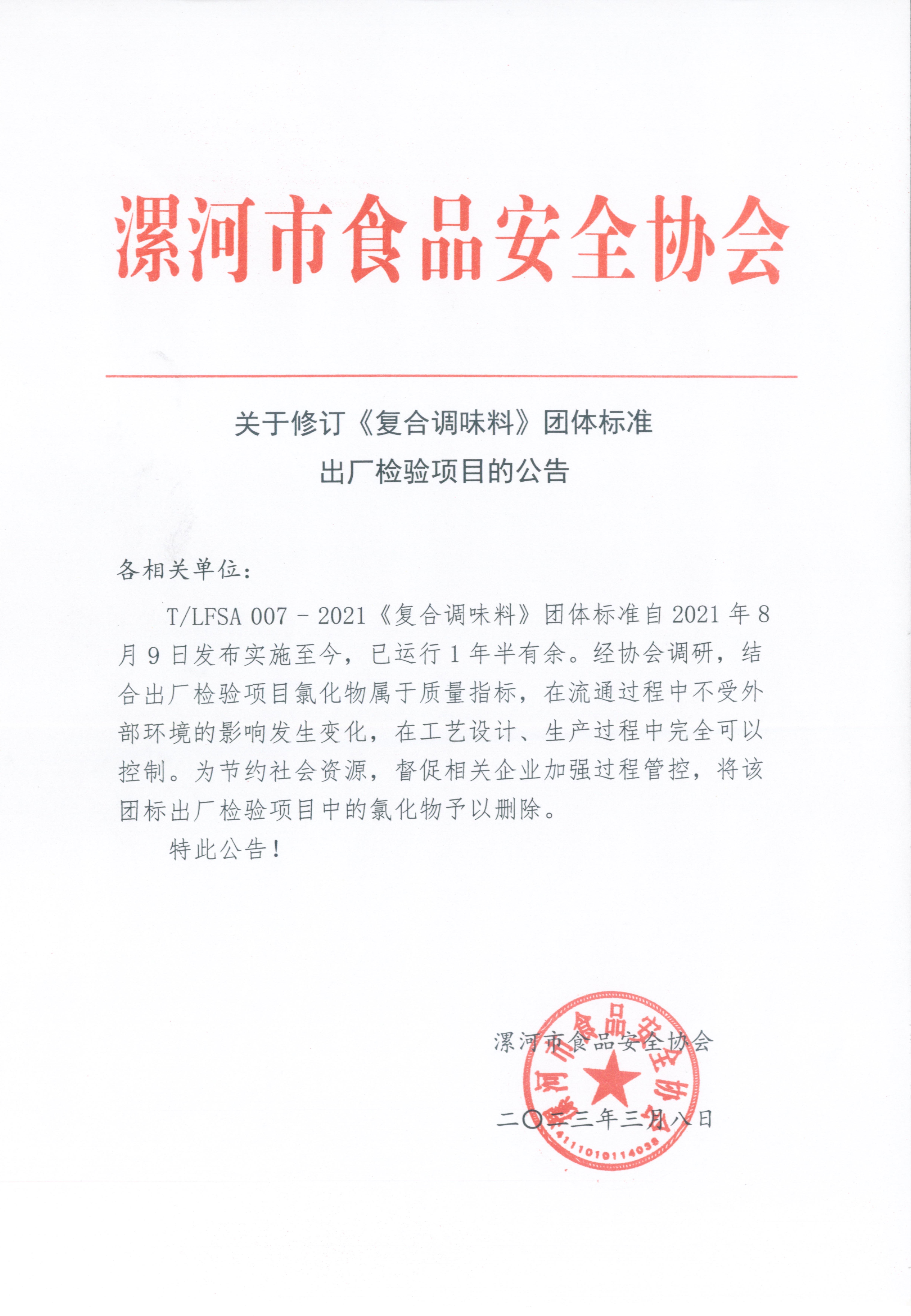 T/LFSA007-2021《复合调味料》团体标准第1号修改单经我协会审查批准发布。建议修改单于2023年3月9日起实施。