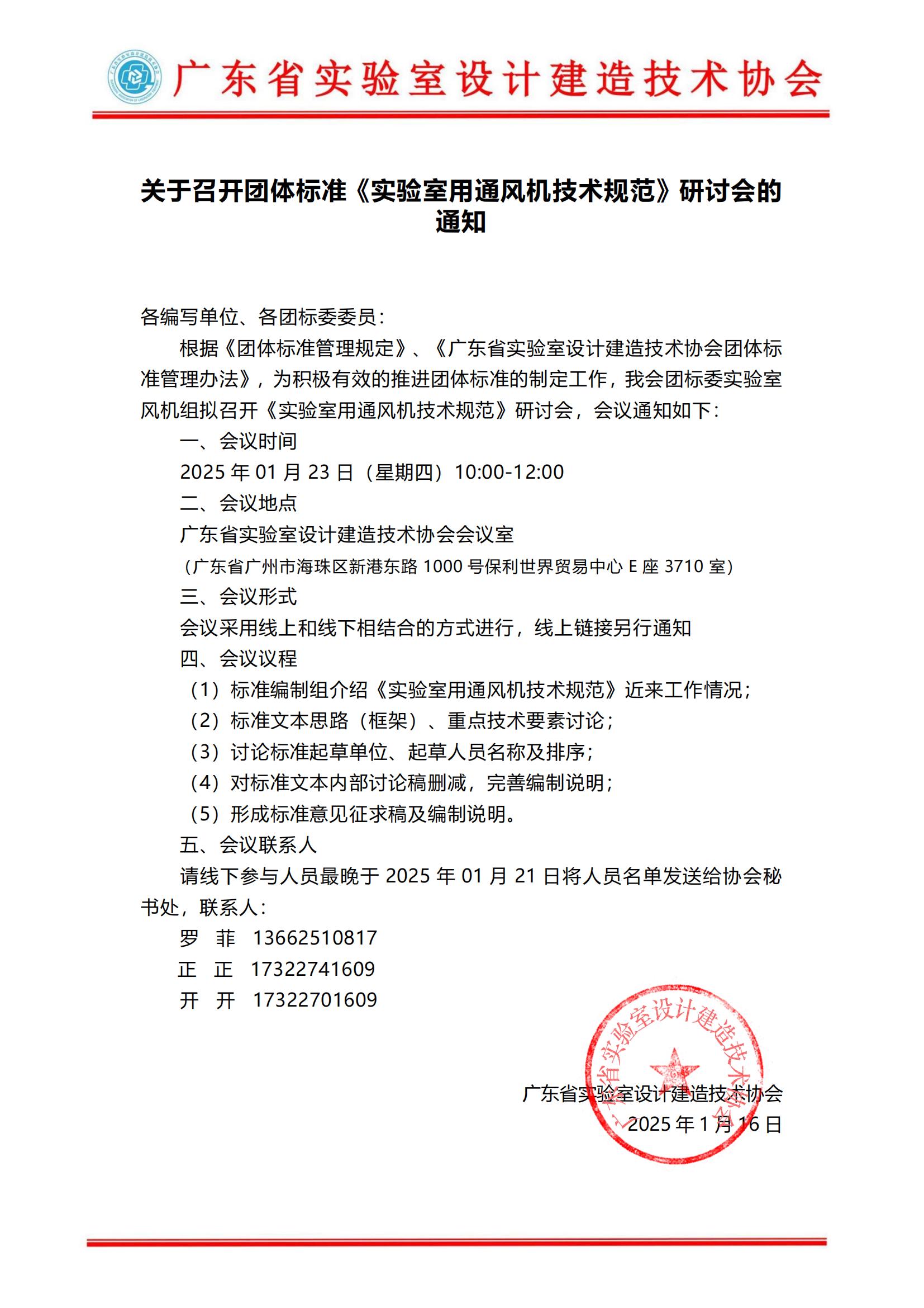 根据《团体标准管理规定》、《广东省实验室设计建造技术协会团体标准管理办法》,为积极有效的推进团体标准的制定工作,我会团标委实验室风机组拟召开《实验室用通风机技术规范》研讨会,会议通知如下: