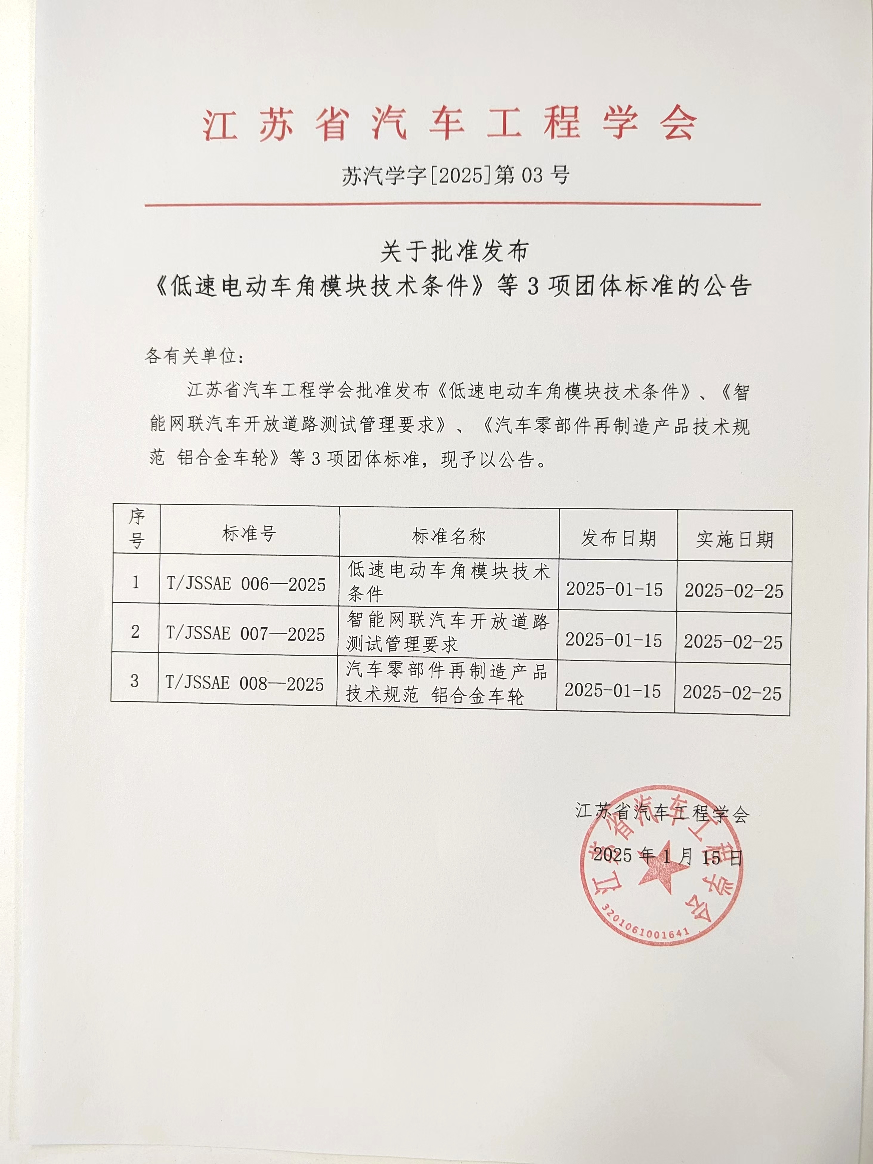 江苏省汽车工程学会批准发布《低速电动车角模块技术条件》、《智能网联汽车开放道路测试管理要求》、《汽车零部件再制造产品技术规范 铝合金车轮》等3项团体标准,现予以公告。