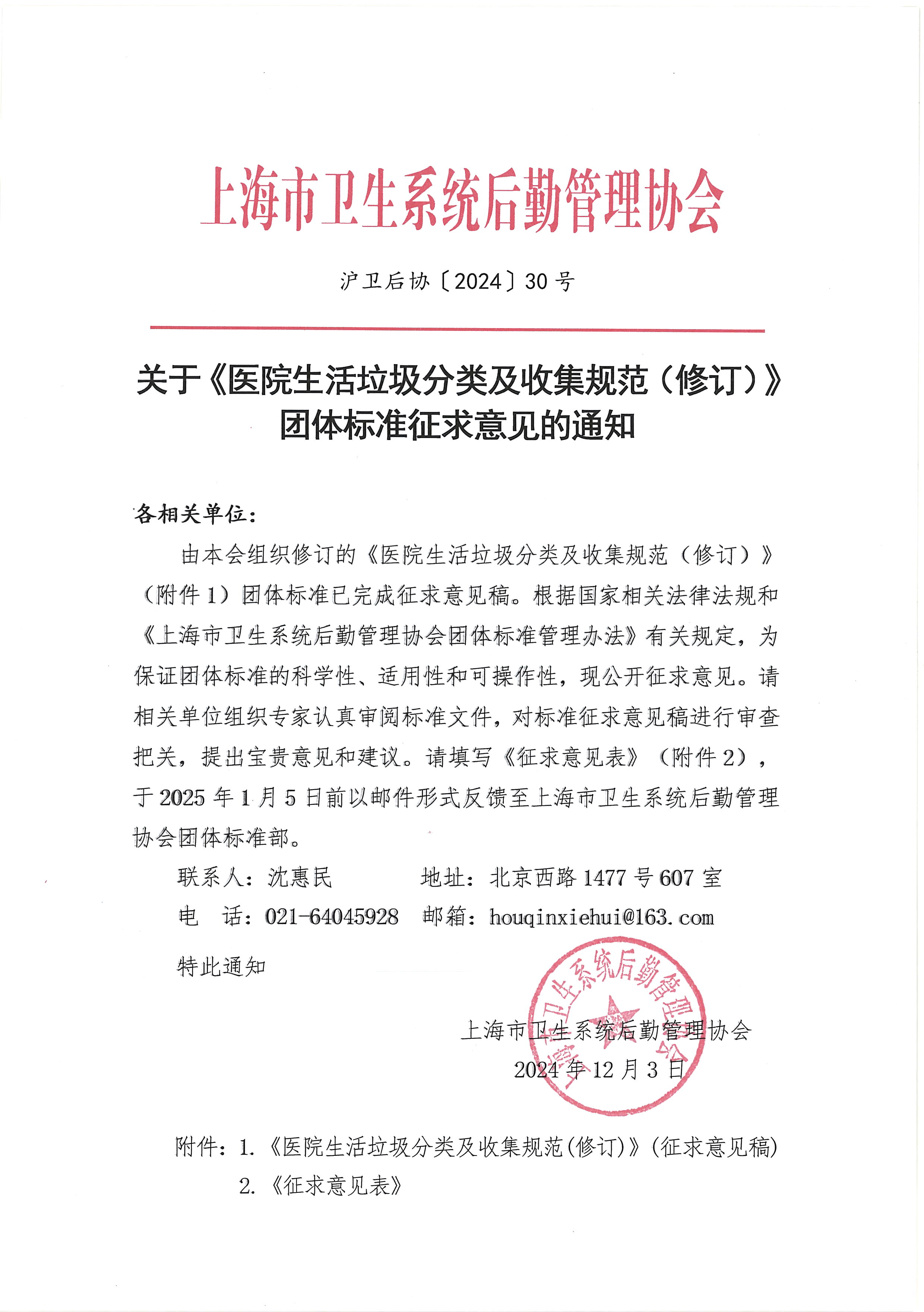 由本会组织修订的《医院生活垃圾分类及收集规范(修订)》(附件1)团体标准已完成征求意见稿。根据国家相关法律法规和《上海市卫生系统后勤管理协会团体标准管理办法》有关规定,为保证团体标准的科学性、适用性和可操作性,现公开征求意见。请相关单位组织专家认真审阅标准文件,对标准征求意见稿进行审查把关,提出宝贵意见和建议。请填写《征求意见表》(附件2),于2025年1月5日前以邮件形式反馈至上海市卫生系统后勤管理协会团体标准部。