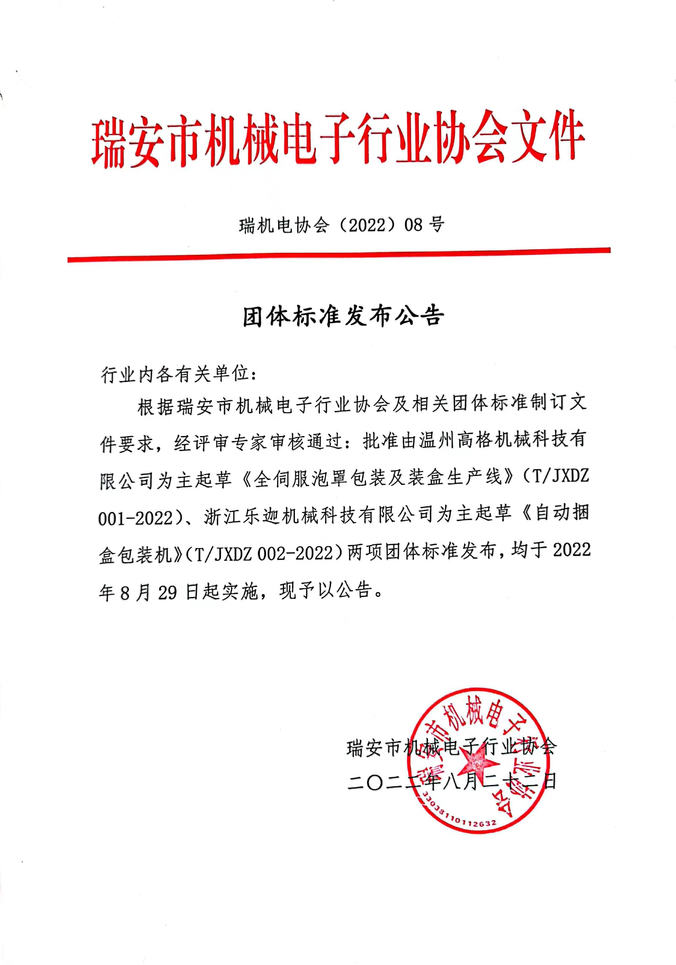 根据《瑞安市机械电子行业协会团体标准管理办法》及相关文件要求,经评审专家审核通过,现批准由温州高格机械科技有限公司为主起草《全伺服泡罩包装及装盒生产线》(T//JXDZ 001-2022)、浙江乐迦机械科技有限公司为主起草《自动捆盒包装机》(T/JXDZ 002-2022)两项团体标准发布,均于2022年8月29日起实施,现予以公告。