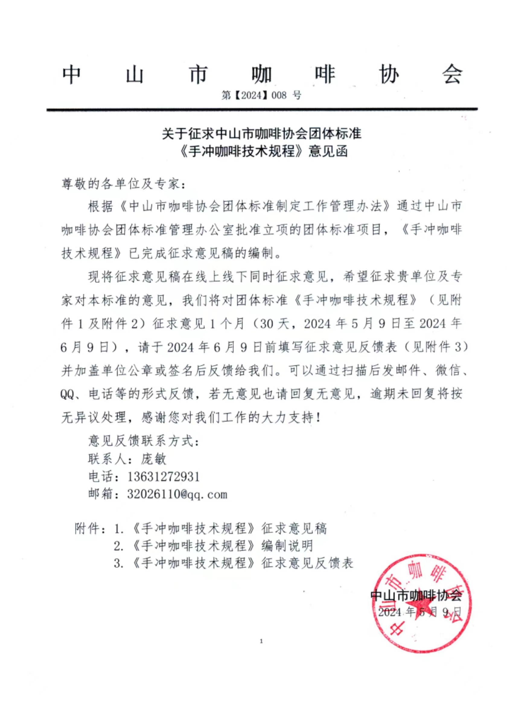 现将征求意见稿在线上线下同时征求意见,希望征求贵单位及专家对本标准的意见,我们将对团体标准《手冲咖啡技术规程》(见附件1及附件2)征求意见1个月(30天,2024年5月9日至2024年6月9日),请于2024年6月9日前填写征求意见反馈表(见附件3)并加盖单位公章或签名后反馈给我们。可以通过扫描后发邮件、微信、QQ、电话等的形式反馈,若无意见也请回复无意见,逾期未回复将按无异议处理,感谢您对我们工作的大力支持!