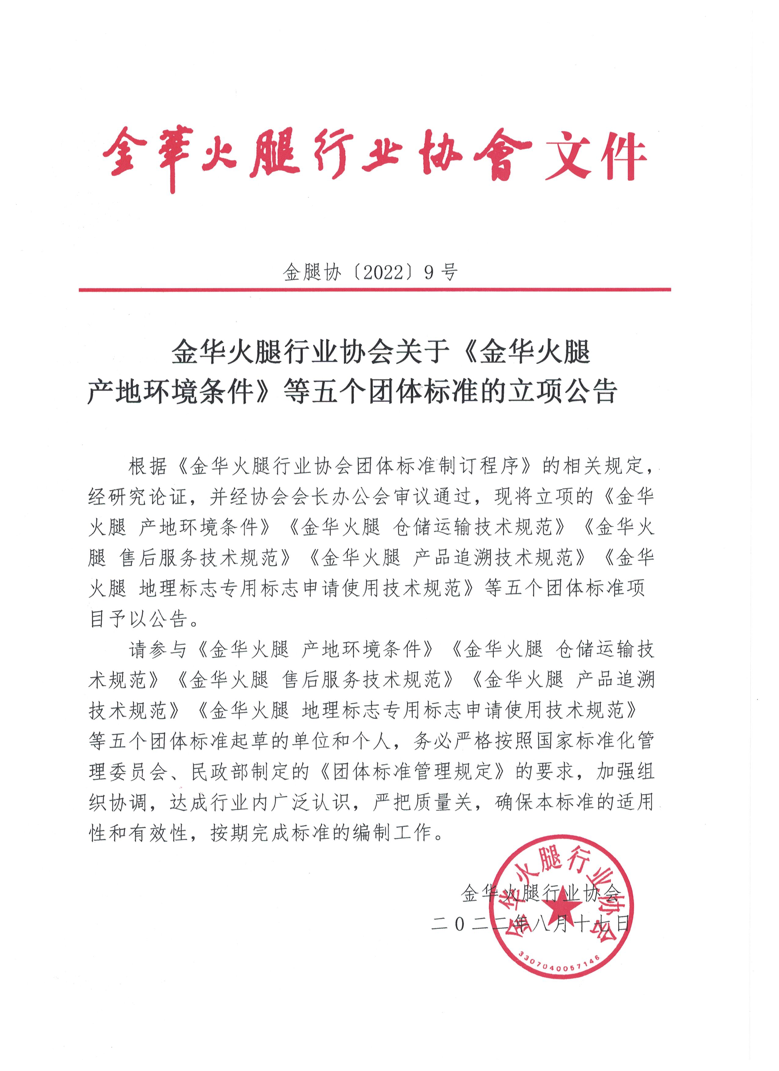 根据《金华火腿行业协会团体标准制订程序》的相关规定,经研究论证,并经协会会长办公会审议通过,现将立项的《金华火腿 产地环境条件》《金华火腿 仓储运输技术规范》《金华火腿 售后服务技术规范》《金华火腿 产品追溯技术规范》《金华火腿 地理标志专用标志申请使用技术规范》等五个团体标准项目予以公告。