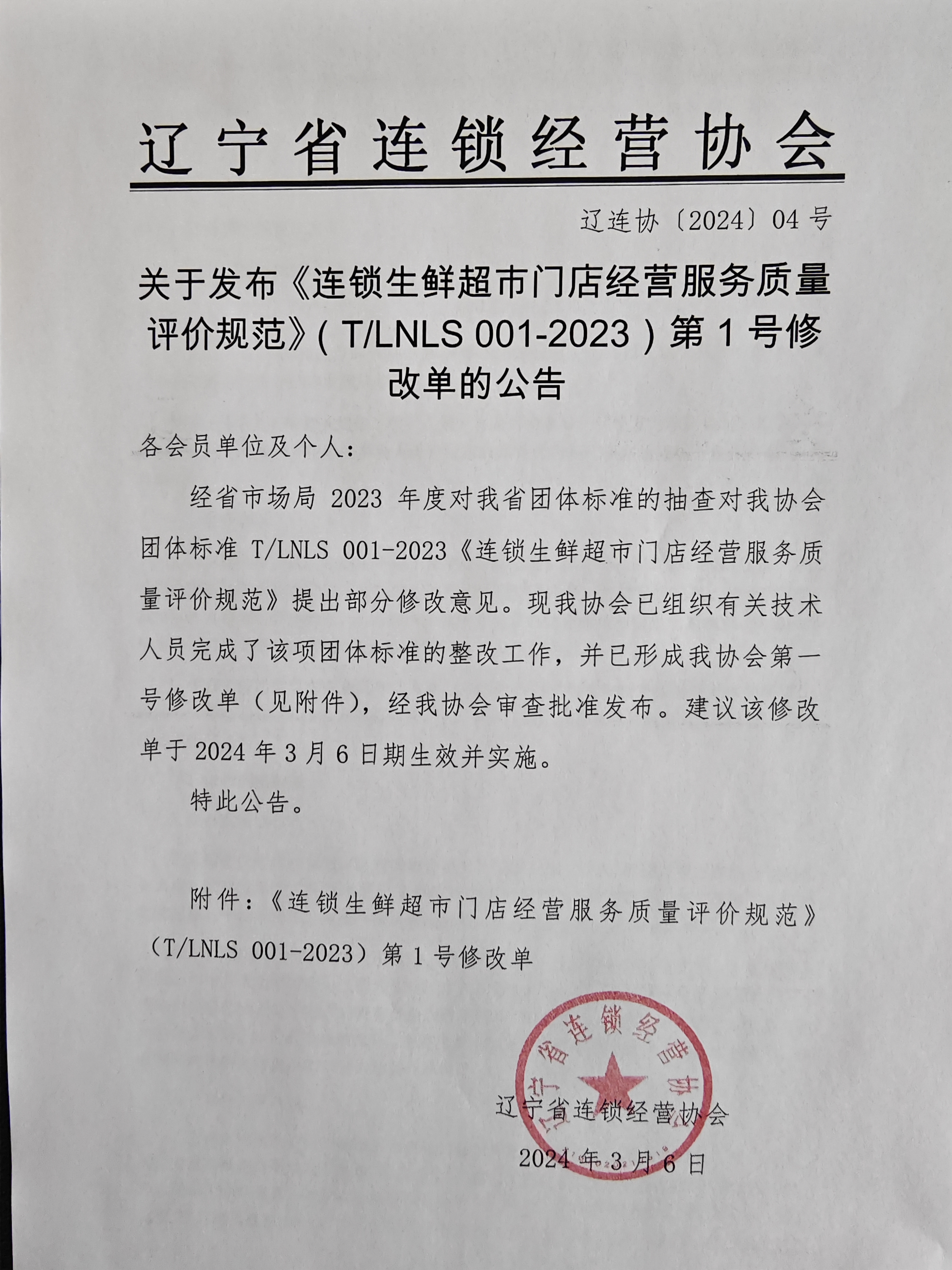 T/LNLS 001-2023《连锁生鲜超市门店经营服务质量评价规范》团体标准第1号修改单 经我团体审查批准发布。建议该修改单于2024年3月6日起实施。