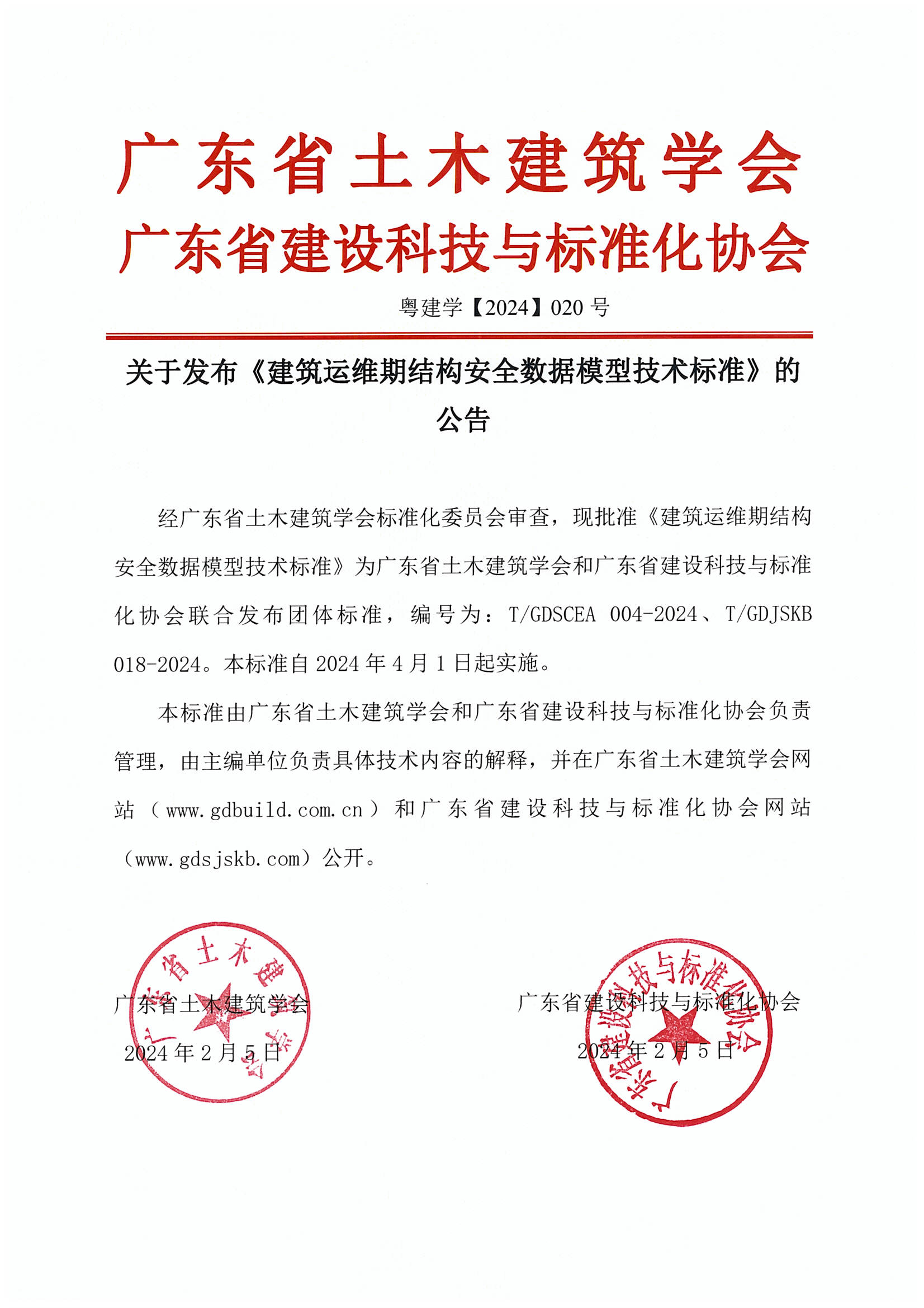经广东省土木建筑学会标准化委员会审查,现批准《建筑运维期结构安全数据模型技术标准》为广东省土木建筑学会和广东省建设科技与标准化协会联合发布团体标准,编号为:T/GDSCEA 004-2024、T/GDJSKB 018-2024。本标准自2024年4月1日起实施。