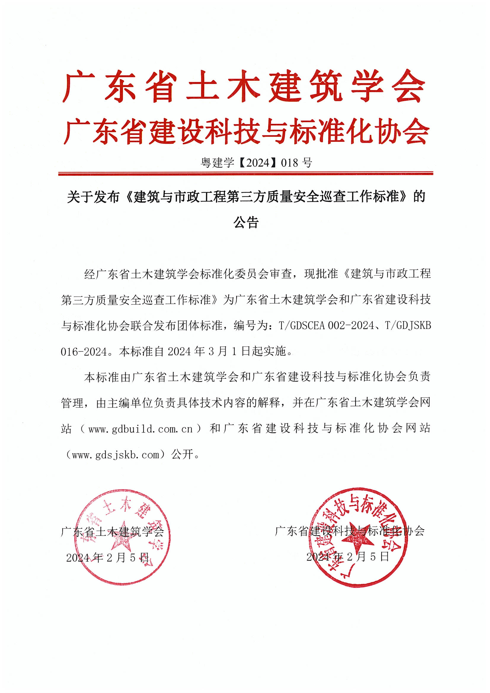 经广东省土木建筑学会标准化委员会审查,现批准为广东省土木建筑学会和广东省建设科技与标准化协会联合发布团体标准,编号为:T/GDSCEA 002-2024、T/GDJSKB 016-2024。本标准自2024年3月1日起实施。