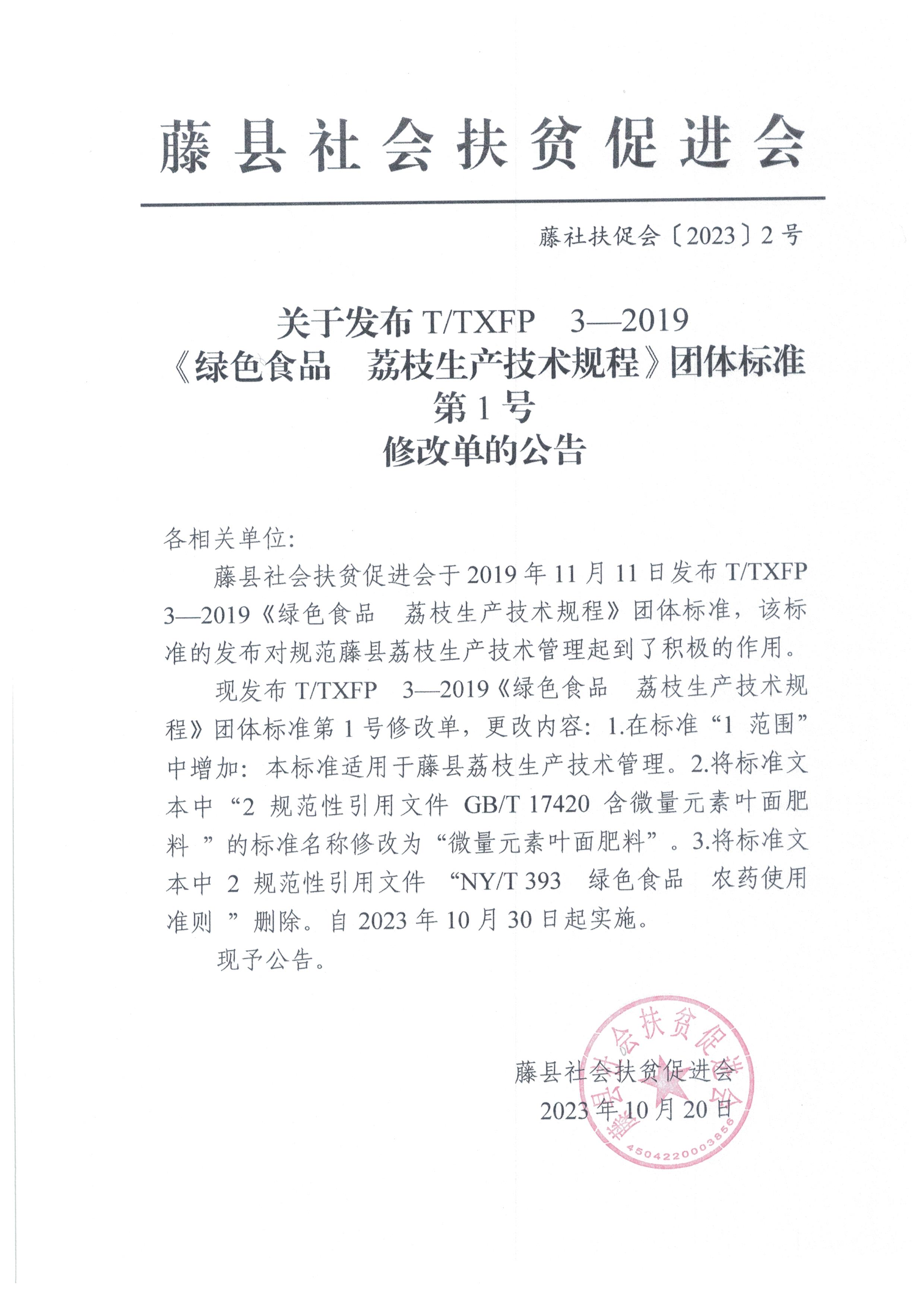 藤县社会扶贫促进会T/TXFP 3—2019 《绿色食品 荔枝生产技术规程》团体标准第1号 修改单