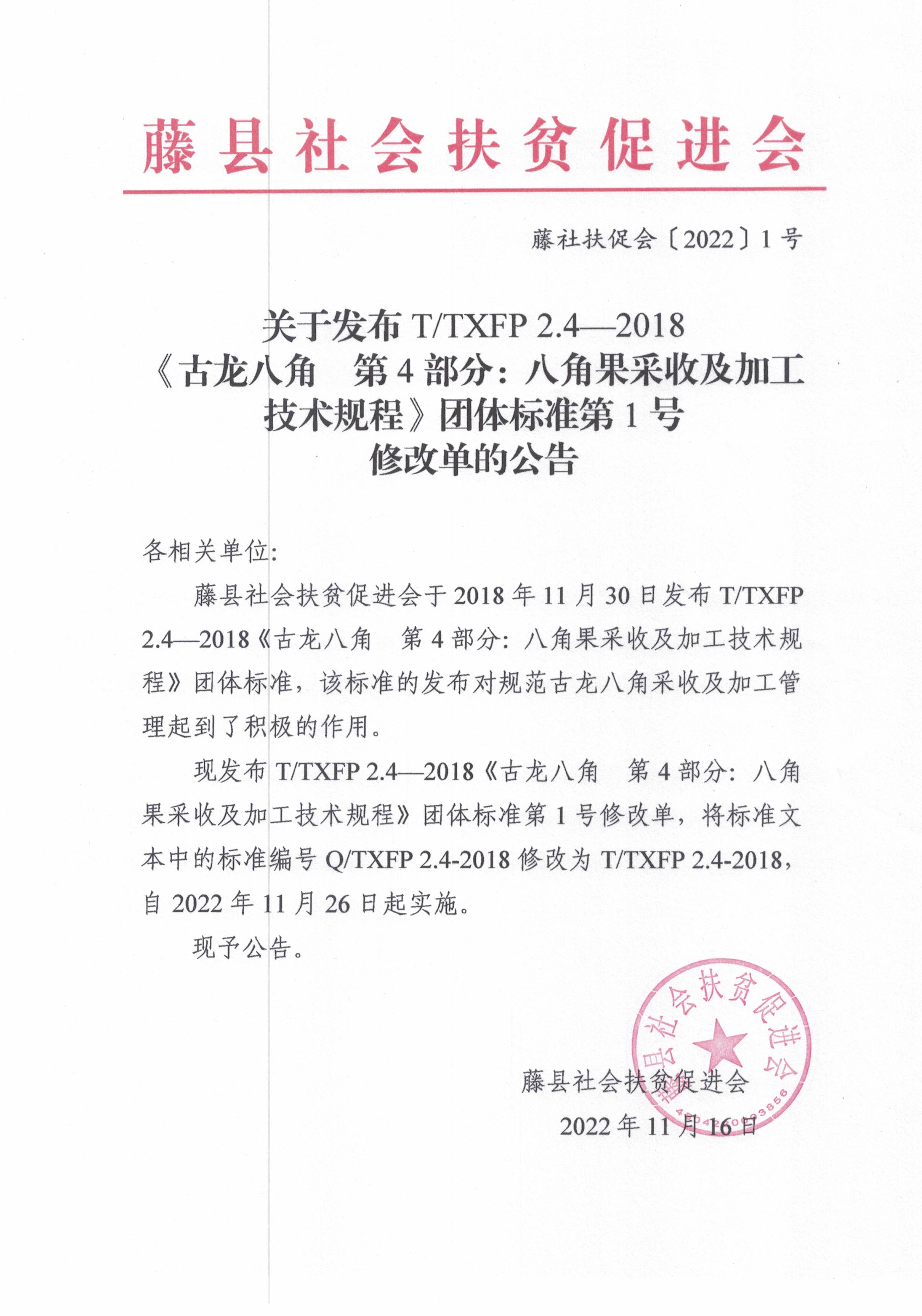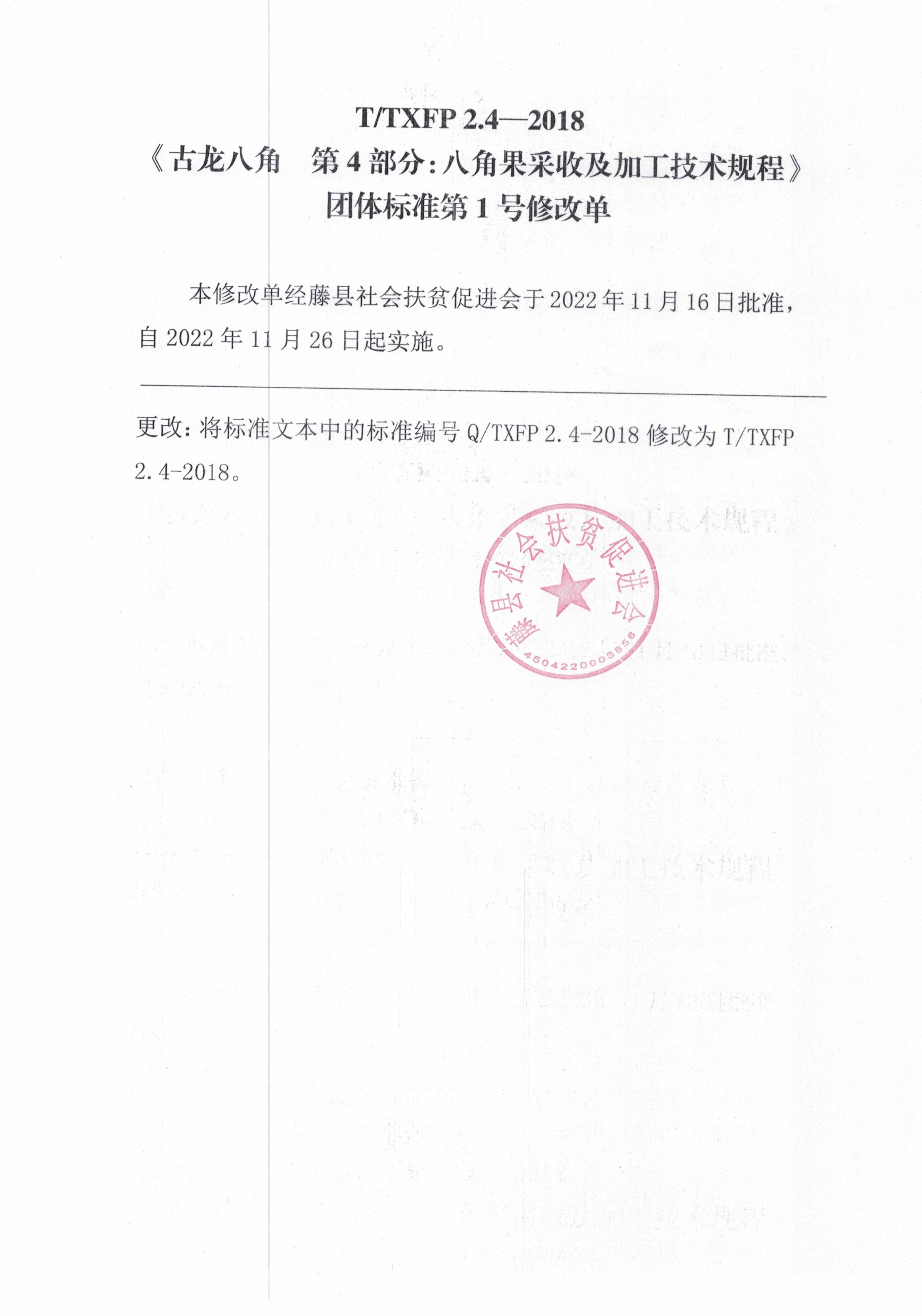 1.关于发布T/TXFP 2.4—2018《古龙八角 第4部分:八角果采收及加工技术规程》团体标准第1号修改单的公告