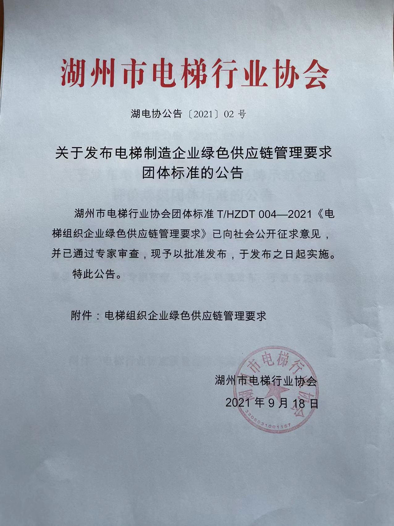 2、 关于发布电梯制造企业绿色供应链管理要求团体标准的公告
