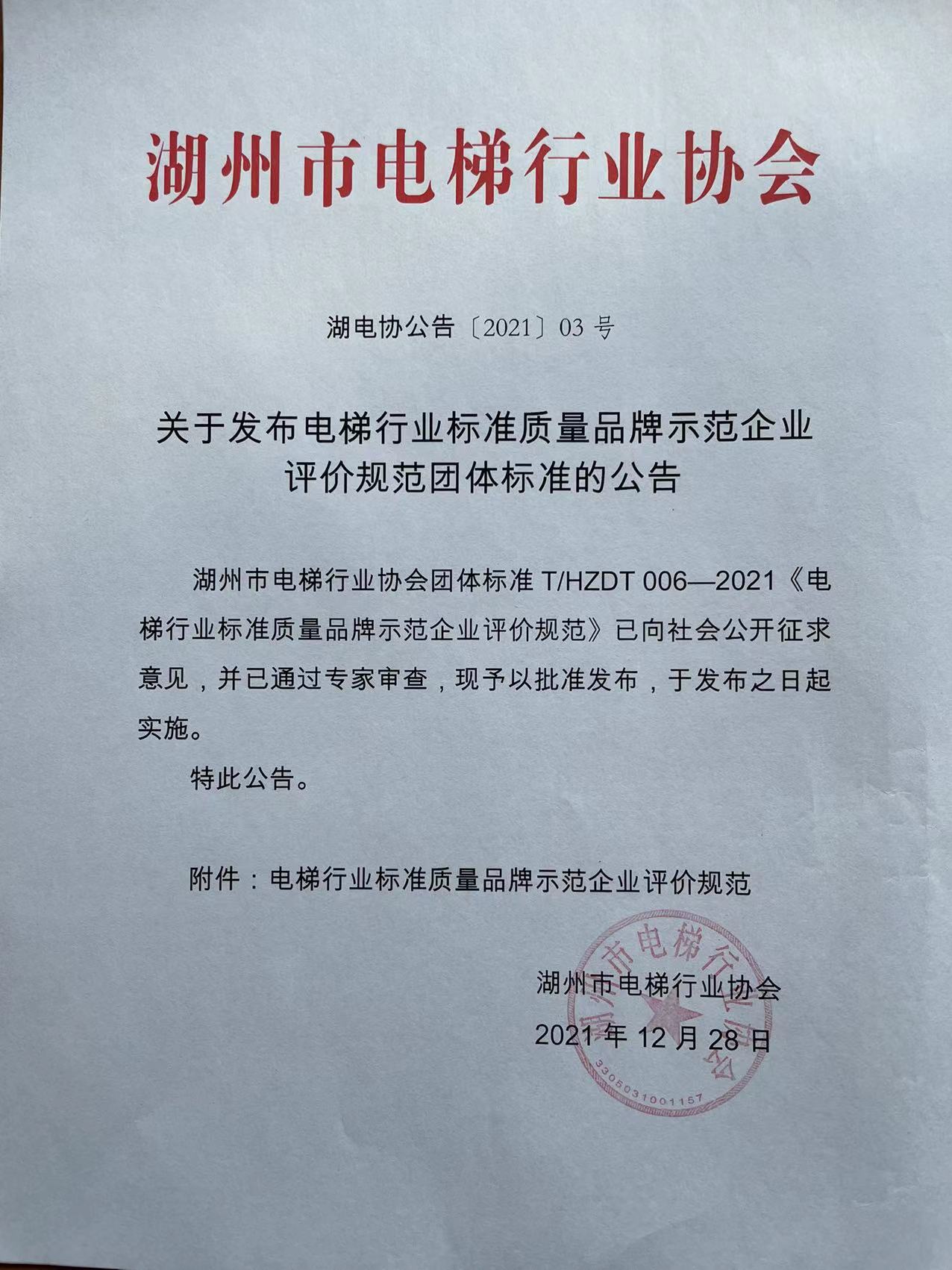 湖州市电梯行业协会团体标准T/HZDT006—2021《电梯行业标准质量品牌示范企业评价规范》已向社会公开征求意见,并已通过专家审查,现予以批准发布,发布时间为2021年12月28日,于发布之日起实施。
