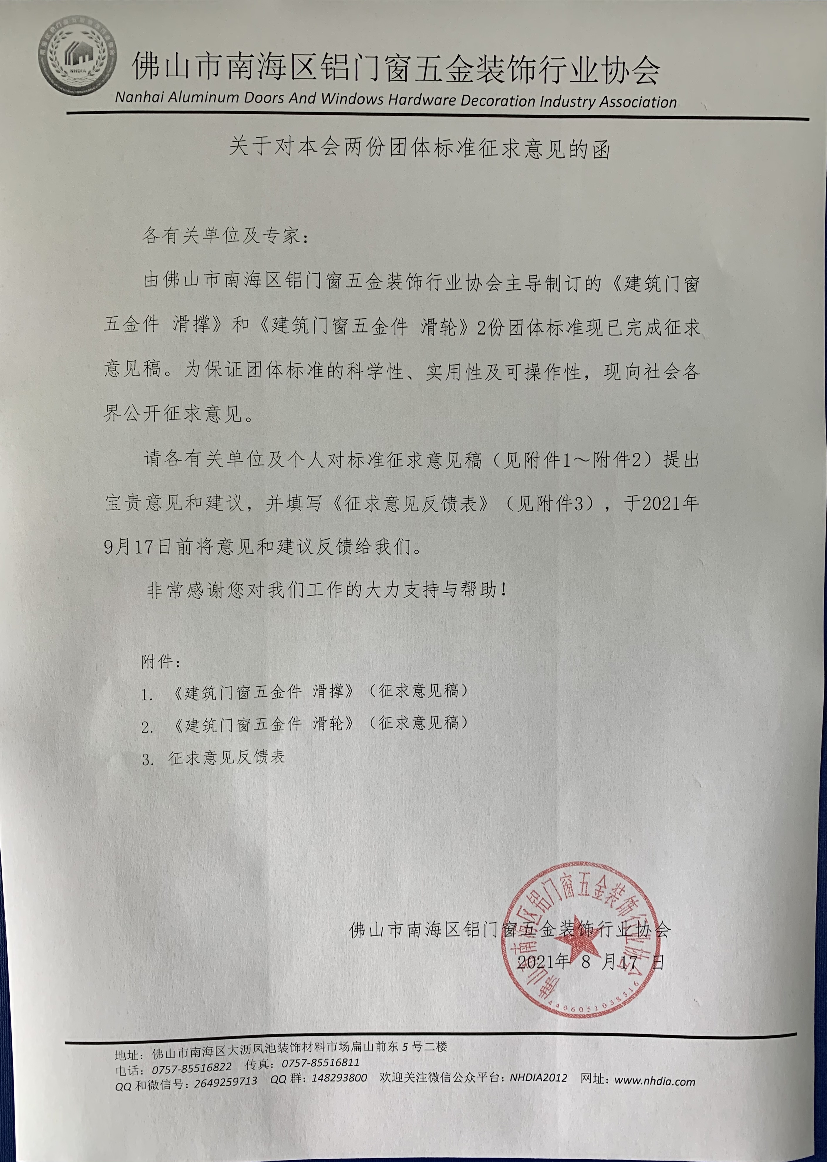 由佛山市南海区铝门窗五金装饰行业协会主导制订的《建筑门窗五金件 滑撑》和《建筑门窗五金件 滑轮》2份团体标准现已完成征求意见稿。为保证团体标准的科学性、实用性及可操作性,现向社会各界公开征求意见。