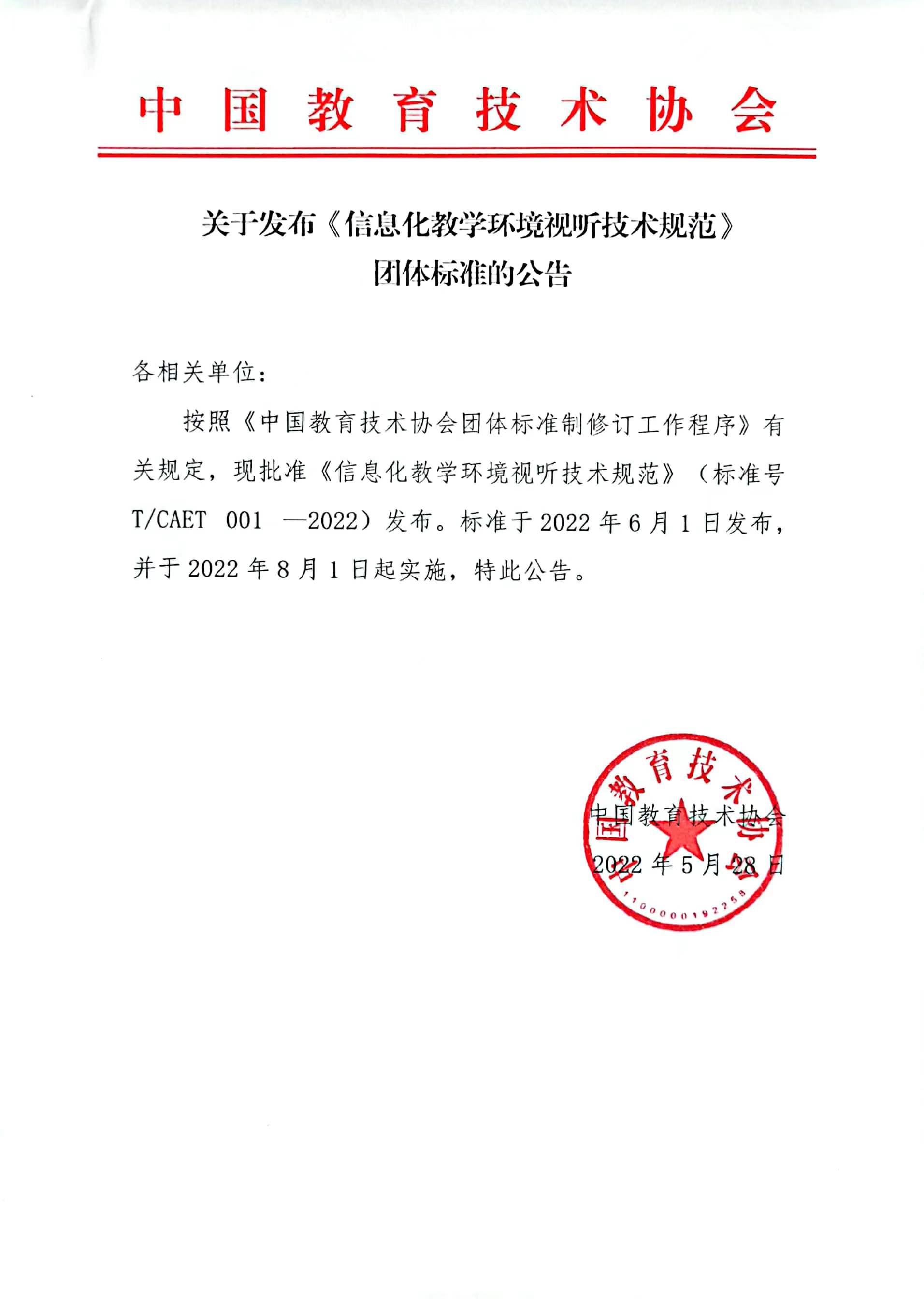 按照《中国教育技术协会团体标准制修订工作程序》有关规定,现批准《信息化教学环境视听技术规范》(标准号T/CAET 001 —2022)发布。标准于2022年6月1日发布,并于2022年8月1日起实施,特此公告。