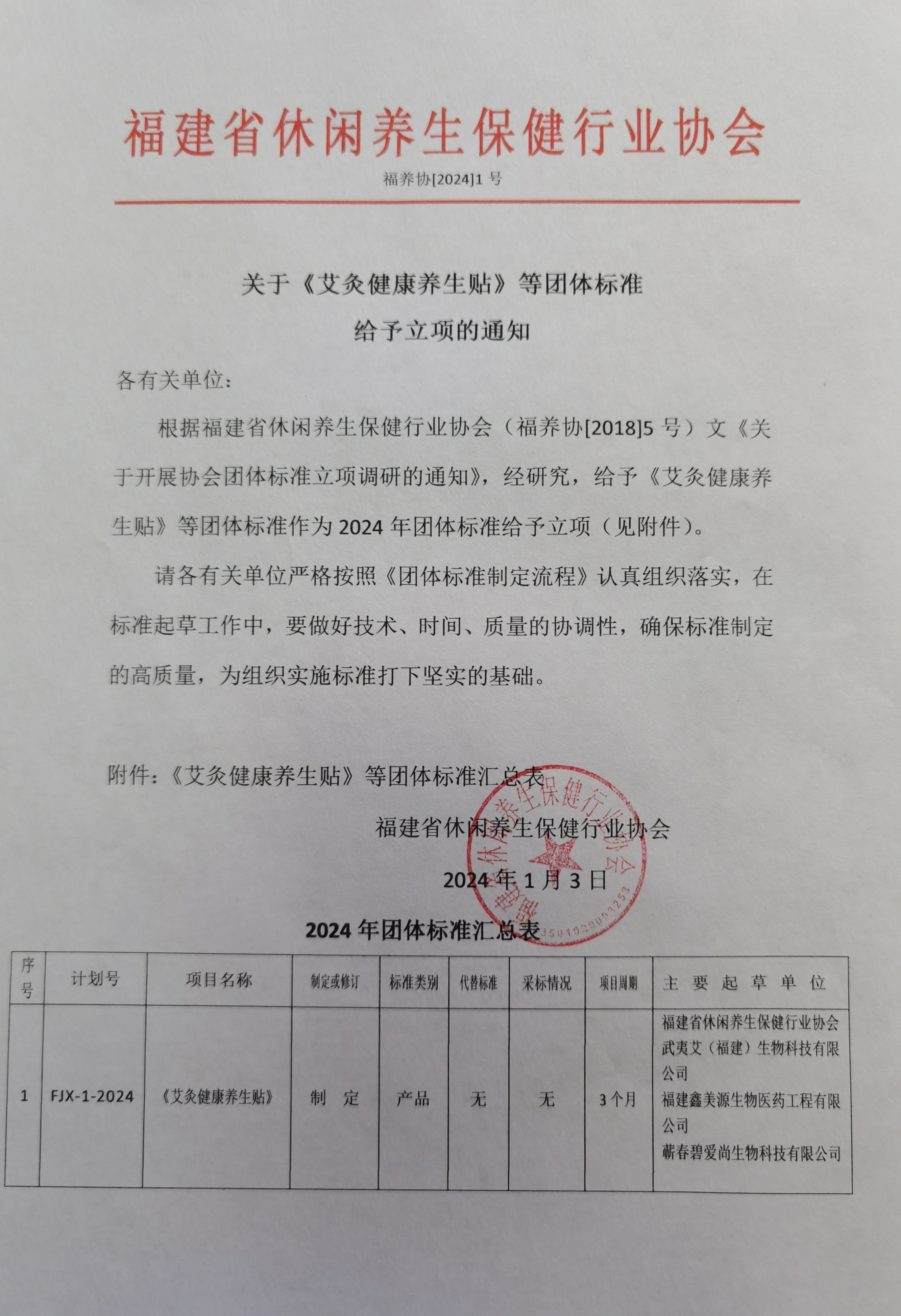 根据福建省休闲养生保健行业协会(福养协[2018]5号)文《关于开展协会团体标准立项调研的通知》,经研究,给予《艾灸健康养生贴》等团体标准作为2024年团体标准给予立项(见附件)。