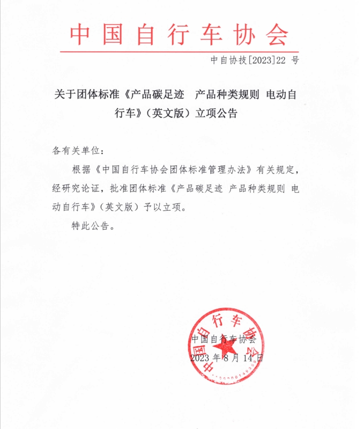根据《中国自行车协会团体标准管理办法》有关规定,经研究论证,批准团体标准《产品碳足迹 产品种类规则 电动自行车》(英文版)予以立项。