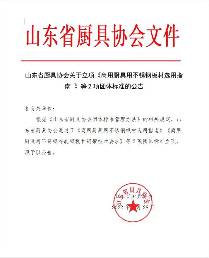 根据《山东省厨具协会团体标准管理办法》的相关规定,山东省厨具协会通过了《商用厨具用不锈钢板材选用指南》《商用厨具用不锈钢冷轧钢板和钢带技术要求》等2项团体标准立项,现予以公告。