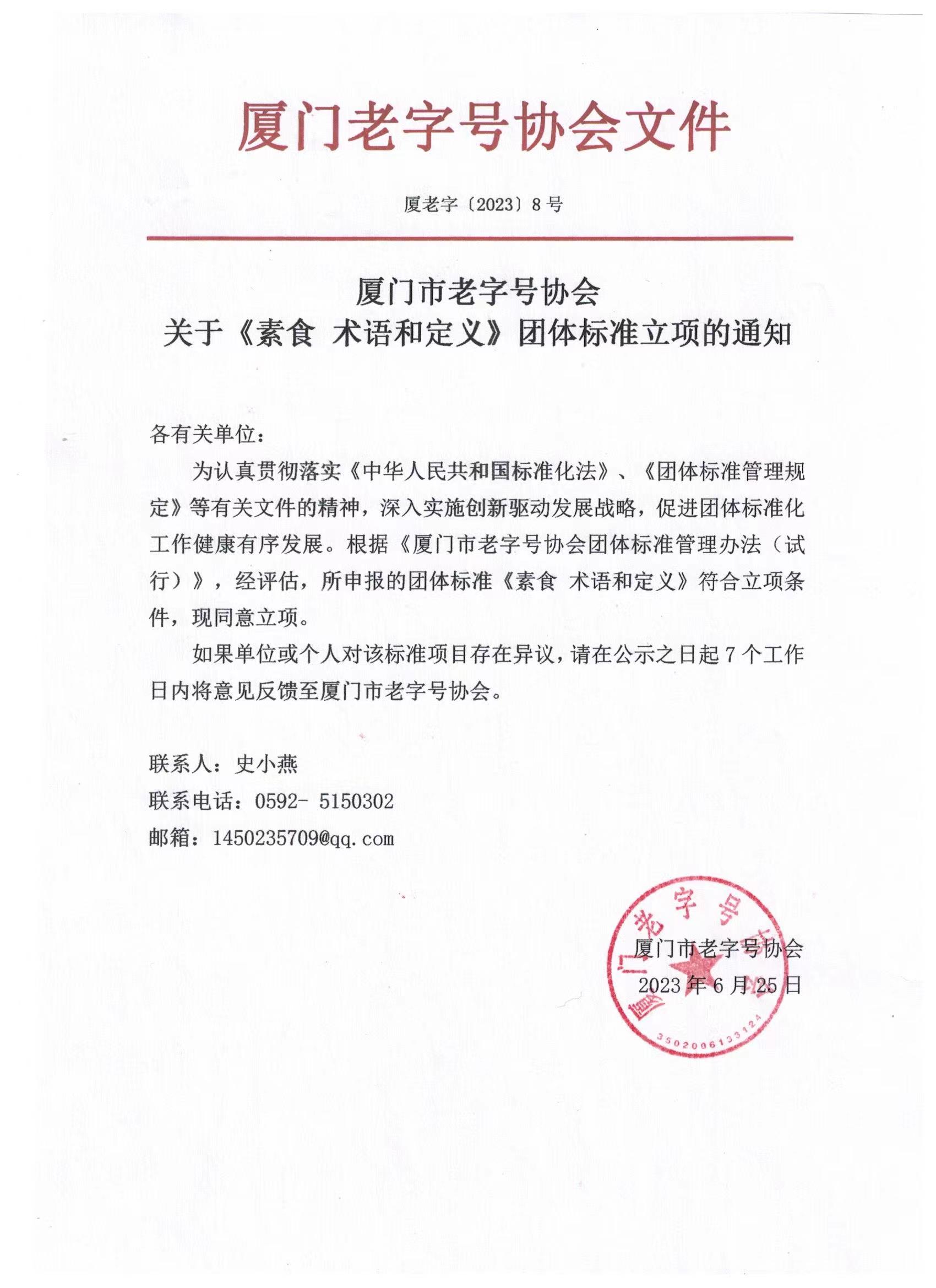 为认真贯彻落实《中华人民共和国标准化法》、《团体标准管理规定》等有关文件的精神,深入实施创新驱动发展战略,促进团体标准化工作健康有序发展。根据《厦门市老字号协会团体标准管理办法(试行)》,经评估,所申报的团体标准《素食 术语和定义》符合立项条件,现同意立项。