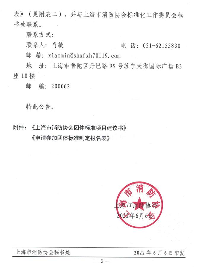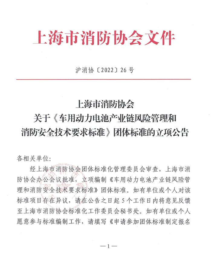 经上海市消防协会团体标准化管理委员会审查,上海市消防协会办公会议批准,立项编制《车用动力电池产业链风险管理和消防安全技术要求标准》团体标准。如有单位或个人对该标准项目存在异议,请在公告之日起5个工作日内将意见反馈至上海市消防协会标准化工作委员会秘书处。如有单位或个人愿意参与标准编制工作,请填写《申请参加团体标准制定报名表》(见附表二),并与上海市消防协会标准化工作委员会秘书处联系。