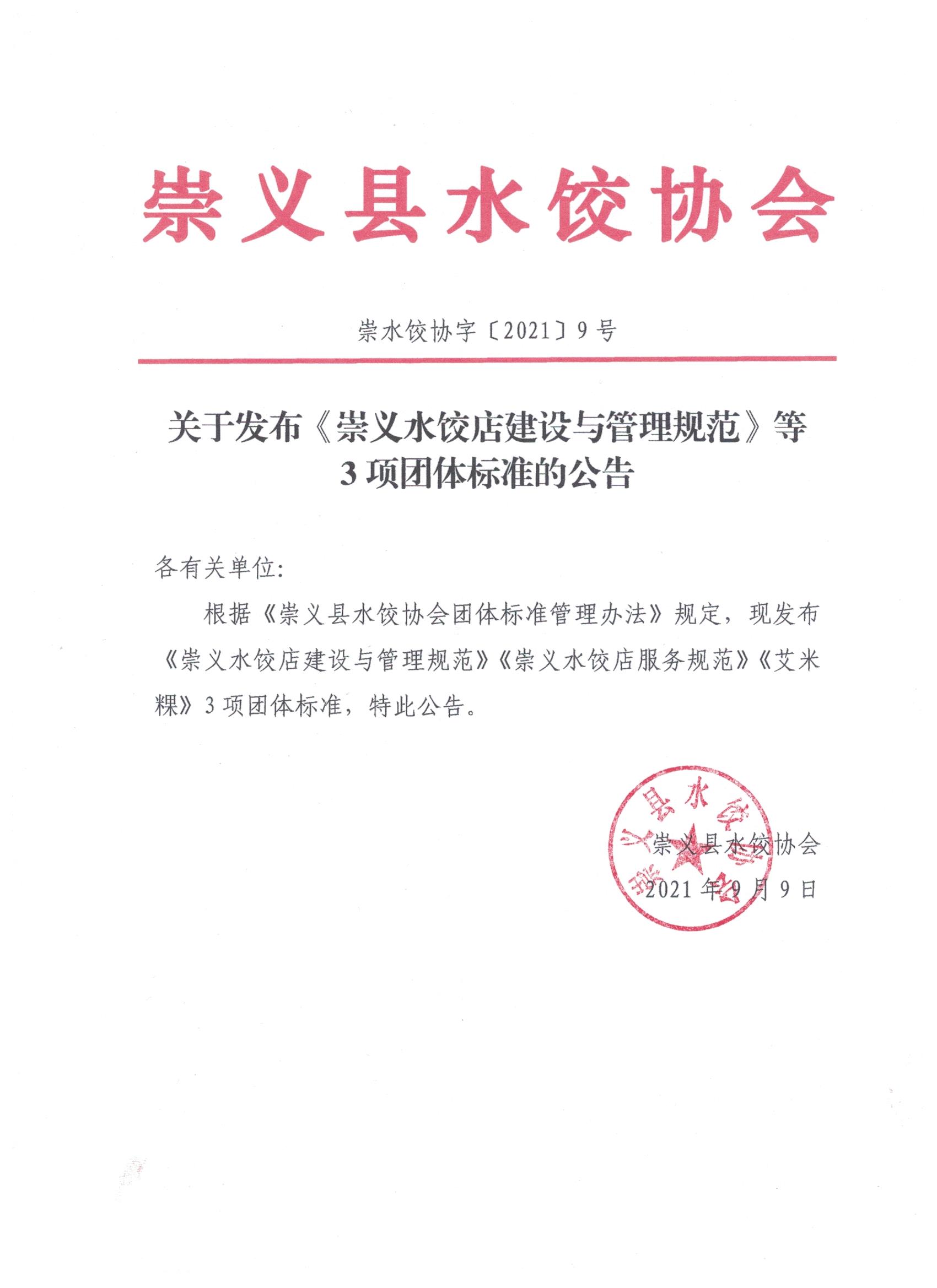 根据《崇义县水饺协会团体标准管理办法》规定,现发布《崇义水饺店建设与管理规范》《崇义水饺店服务规范》、《艾米粿》3项团体标准,特此公告。