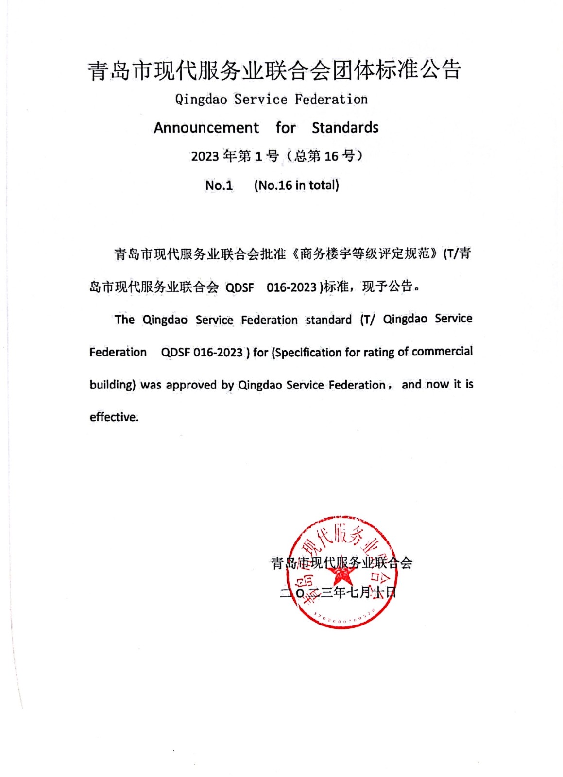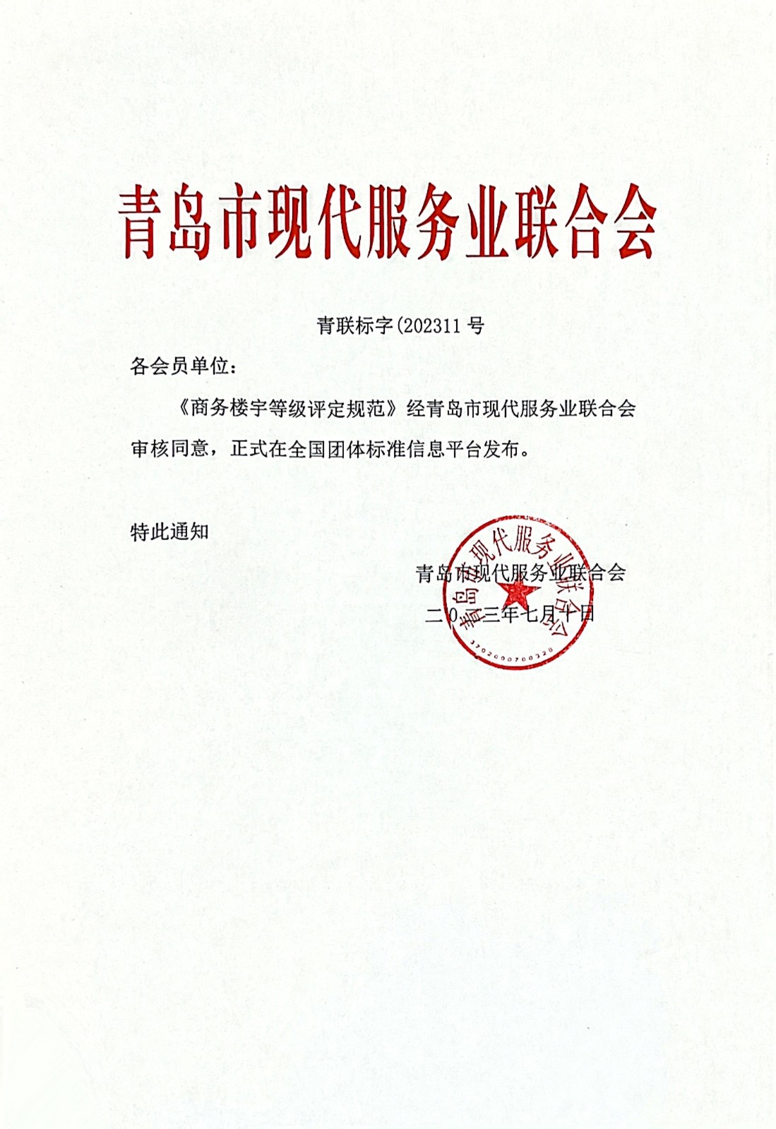 青岛市现代服务业联合会关于《商务楼宇等级评定规范》团体标准发布的公告