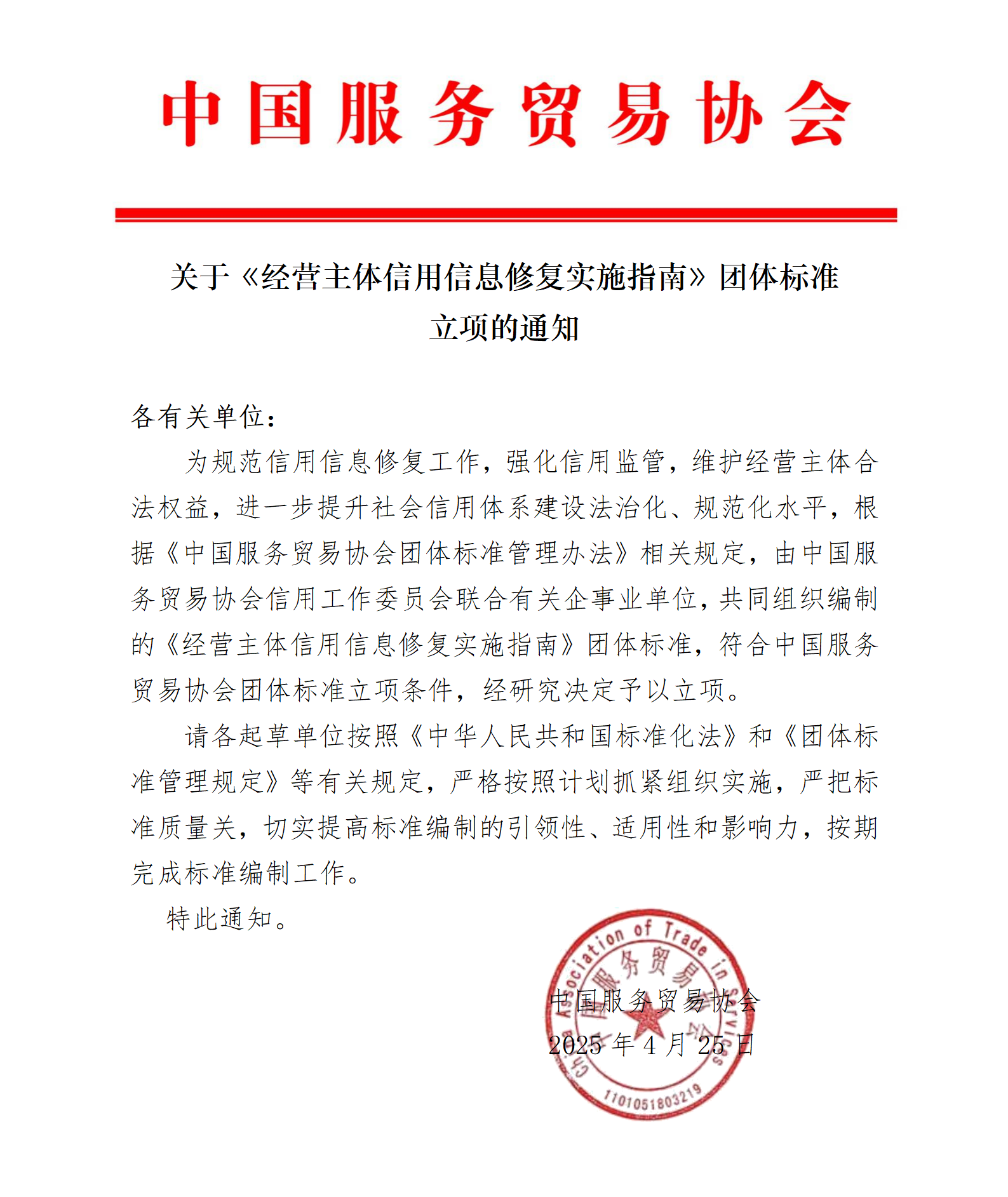 为规范信用信息修复工作,强化信用监管,维护经营主体合法权益,进一步提升社会信用体系建设法治化、规范化水平,根据《中国服务贸易协会团体标准管理办法》相关规定,由中国服务贸易协会信用工作委员会联合有关企事业单位,共同组织编制的《经营主体信用信息修复实施指南》团体标准,符合中国服务贸易协会团体标准立项条件,经研究决定予以立项。