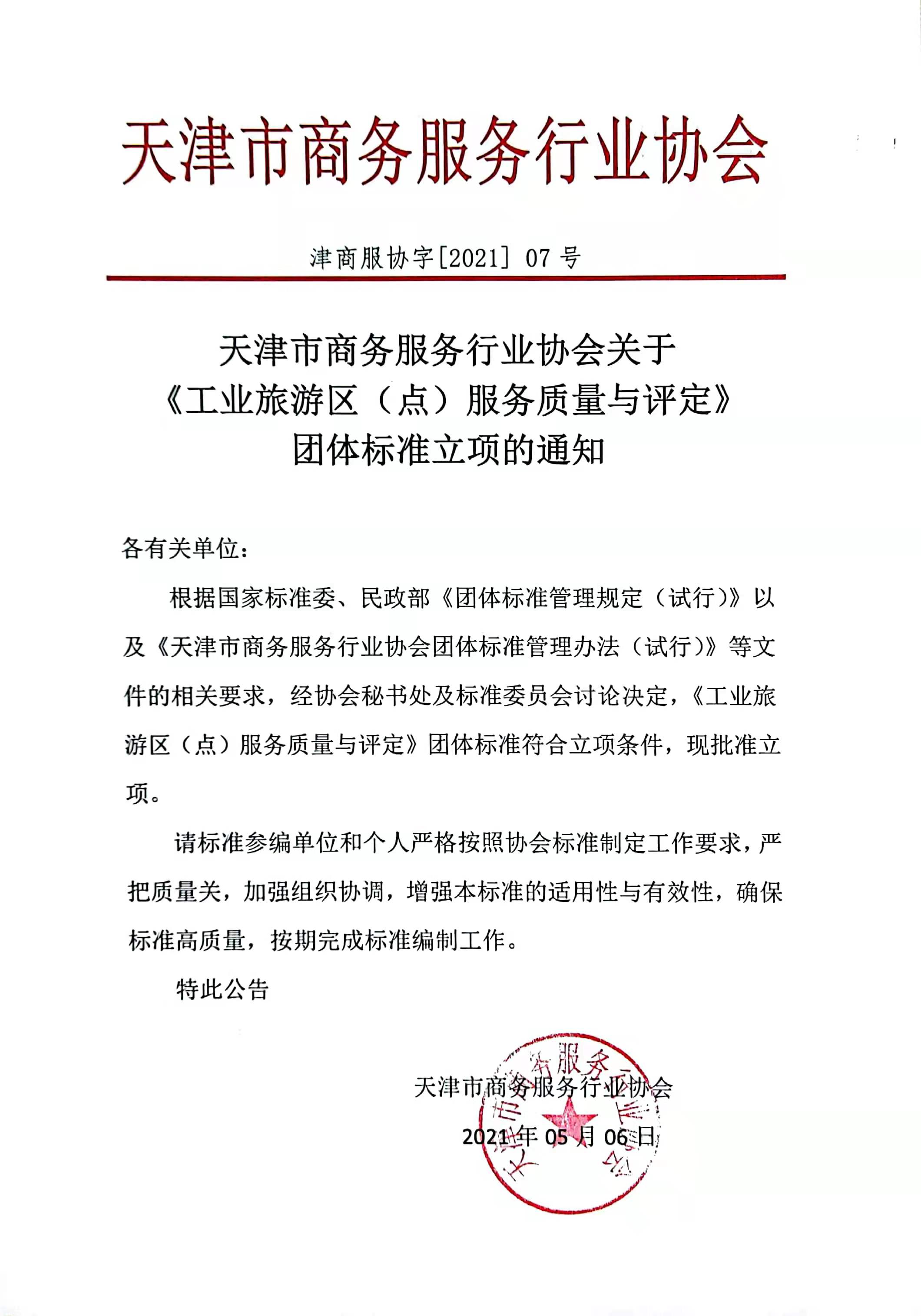 根据国家标准委、民政部《团体标准管理规定(试行)》以及《天津市商务服务行业协会团体标准管理办法(试行)》等文件的相关要求,经协会秘书处及标准委员会讨论决定,《工业旅游区(点)服务质量与评定》团体标准符合立项条件,现批准立项。