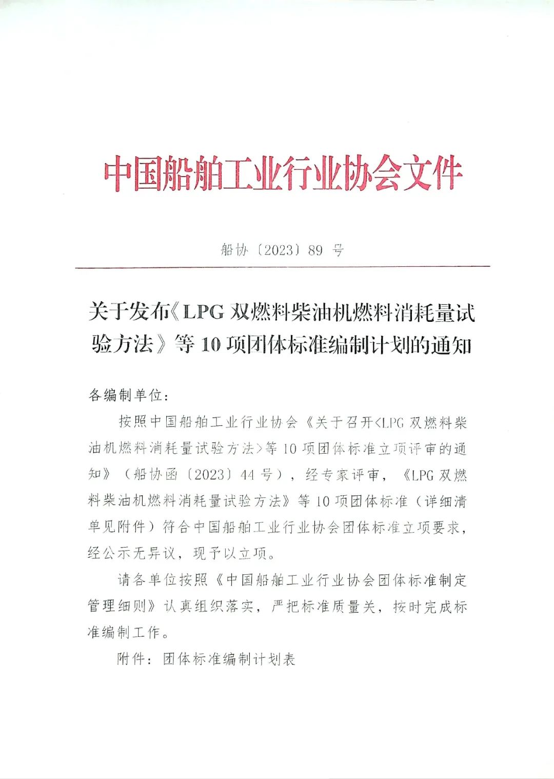 中国船舶工业行业协会关于发布《LPG双燃料柴油机燃料消耗量试验方法》等10项团体标准编制计划的通知