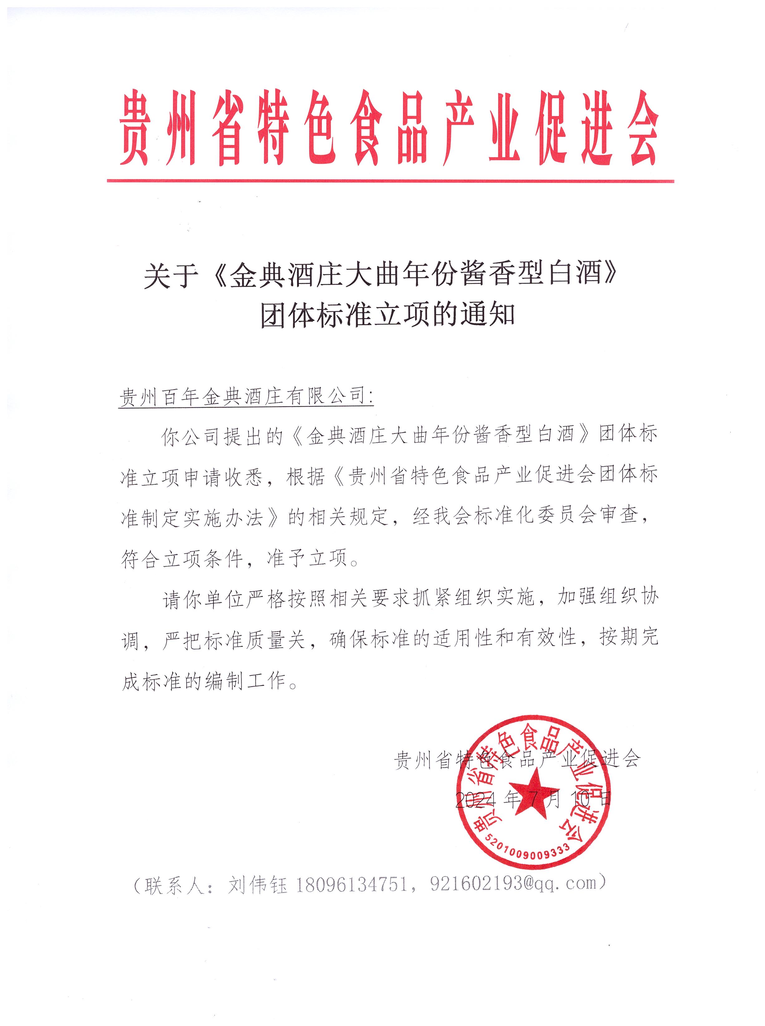 你公司提出的《金典酒庄大曲年份酱香型白酒》团体标准立项申请收悉,根据《贵州省特色食品产业促进会团体标准制定实施办法》的相关规定,经我会标准化委员会审查,符合立项条件,准予立项。