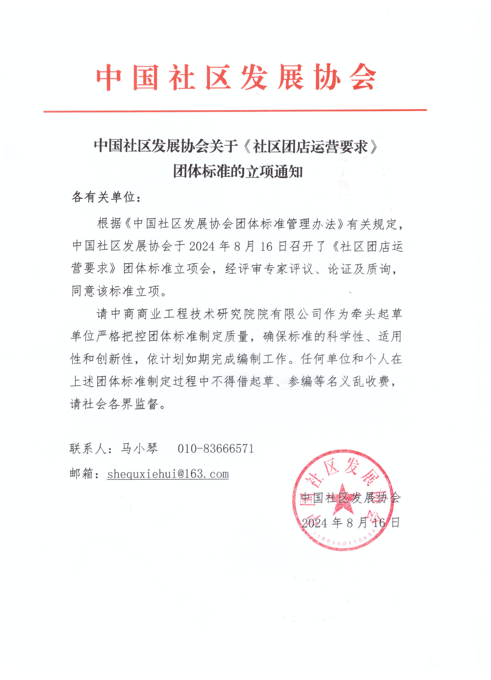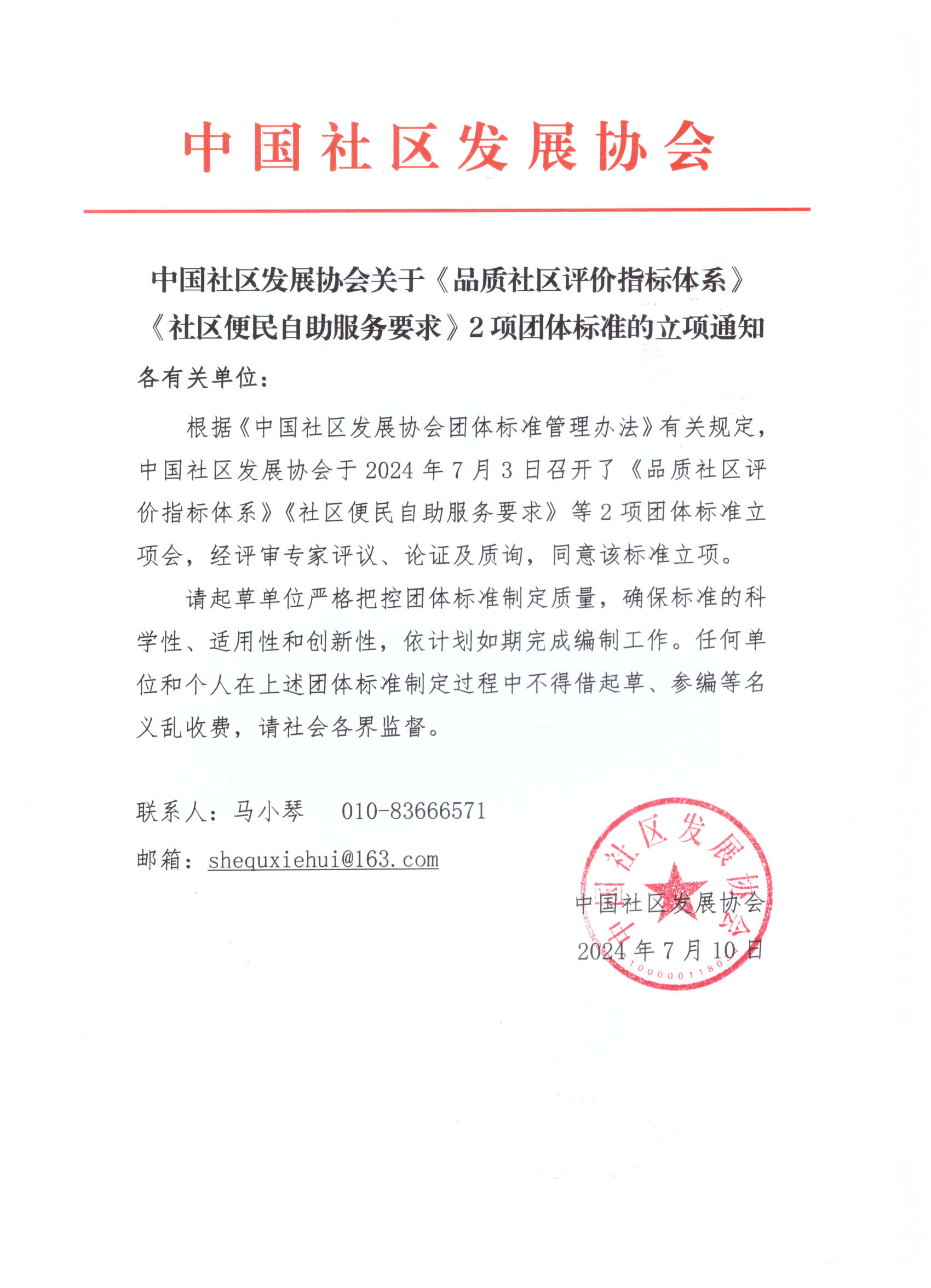 根据《中国社区发展协会团体标准管理办法》有关规定,中国社区发展协会于分别2024年7月3日召开了《品质社区评价指标体系》《社区便民自助服务要求》团体标准立项会,于2024年8月16日召开了《社区团店运营要求》团体标准立项评审会。经评审专家评议、论证及质询,同意以上3项团体标准标准立项。