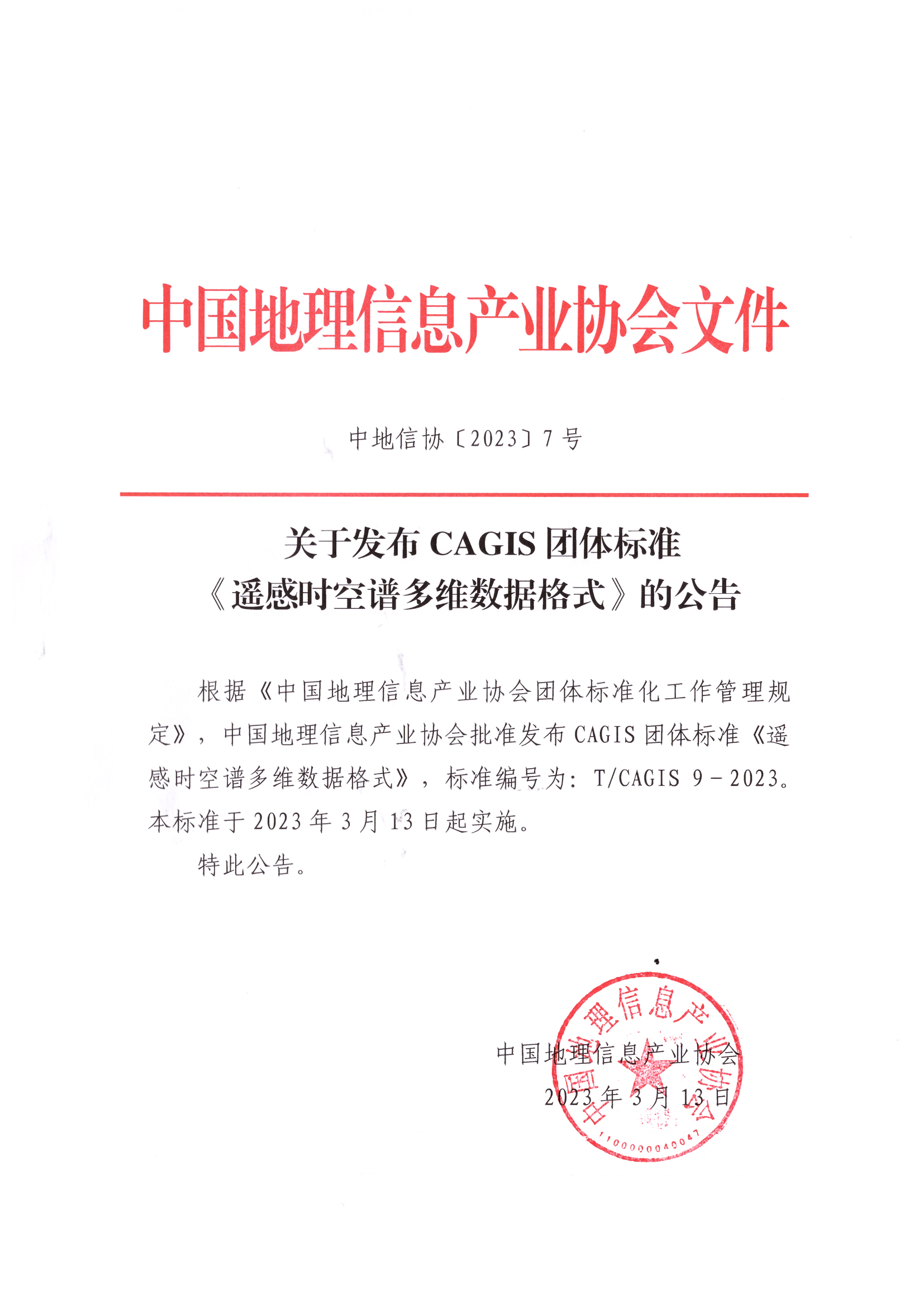 根据《中国地理信息产业协会团体标准化工作管理规定》,中国地理信息产业协会批准发布CAGIS团体标准《遥感时空谱多维数据格式》,标准编号为:T/CAGIS 9-2023。本标准于2023年3月13日起实施。